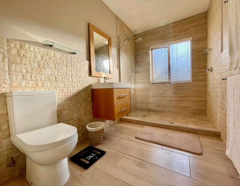 The apartment features an automated single garage equipped with plumbing for appliances, as well as modern conveniences like an inverter with battery, solar panels to save on electricity, security cameras, and high-speed fiber internet. Each of the spacious bedrooms, as well as the lounge, is fitted with ceiling fans, while the main bedroom and lounge also benefit from air conditioning.
