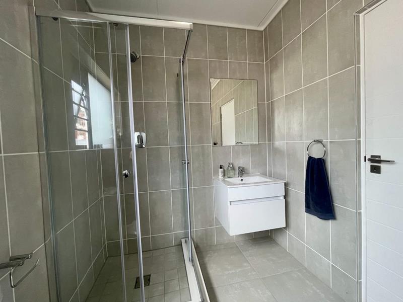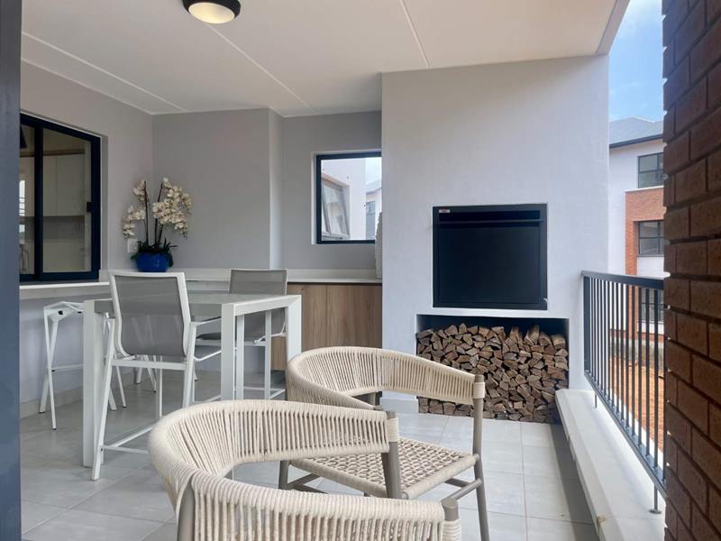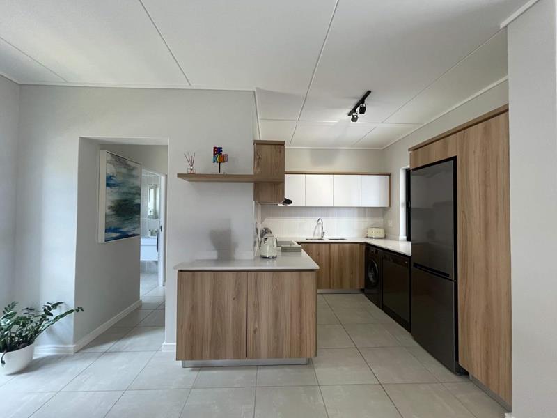 The open-plan kitchen is fitted with quality appliances including a fridge-freezer, washing machine, and dishwasher. Flowing seamlessly into the lounge and dining area, the space opens out onto a large covered patio complete with a built-in braai – perfect for entertaining.
