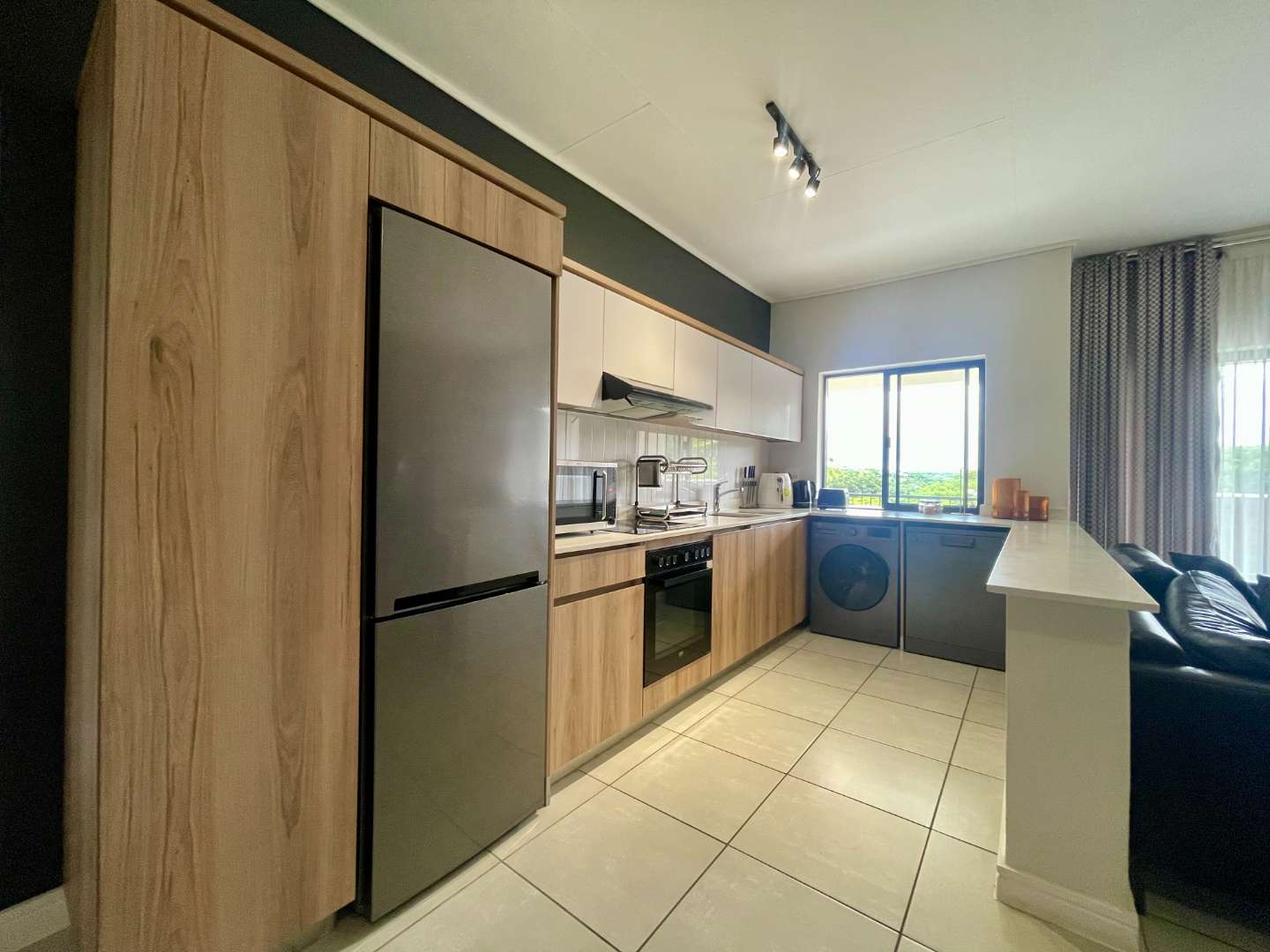A modern, well-equipped kitchen that is rented with Defy Washing Machine, Dishwasher and Fridge, seamlessly blends with the open-plan living area.