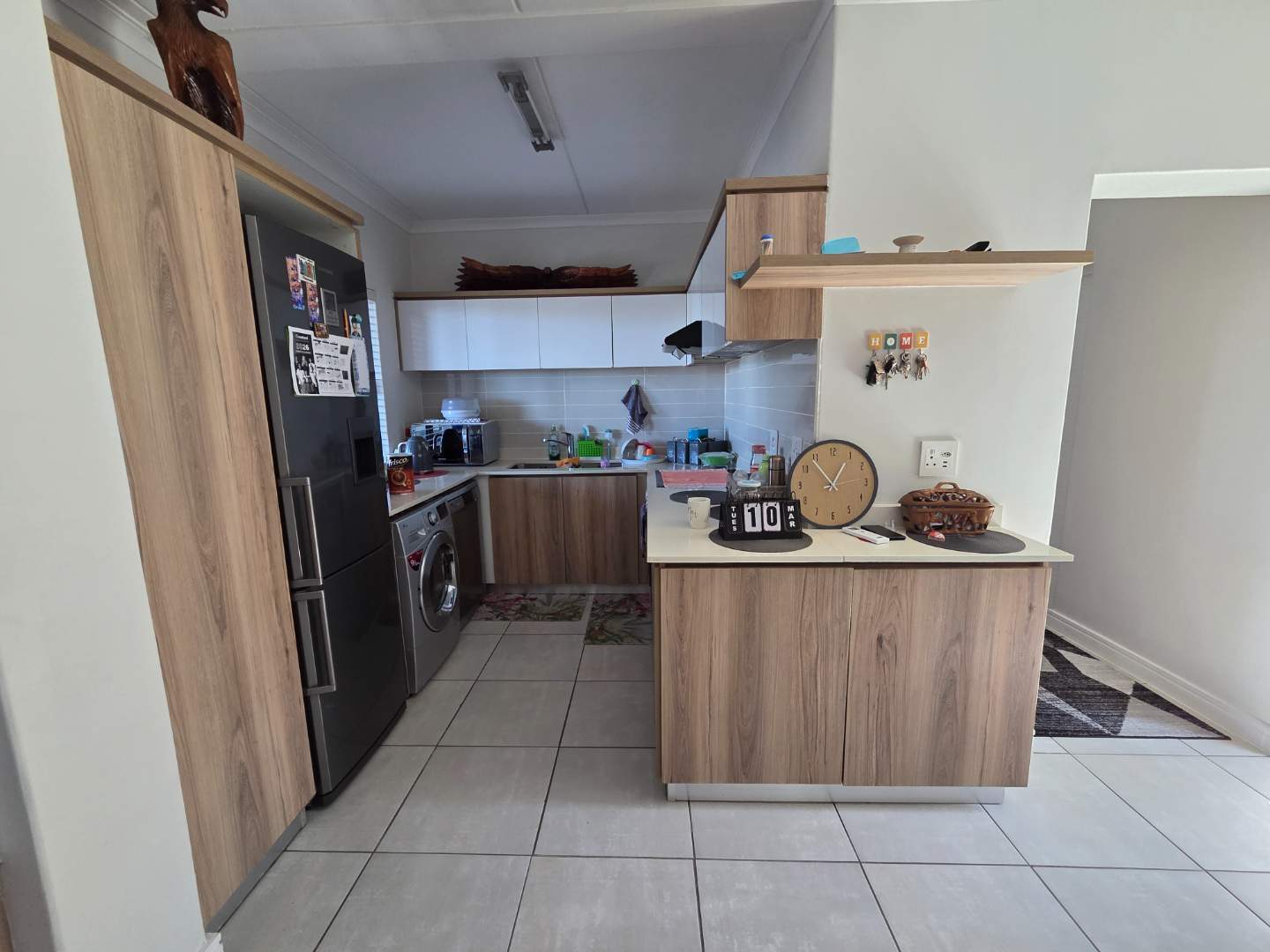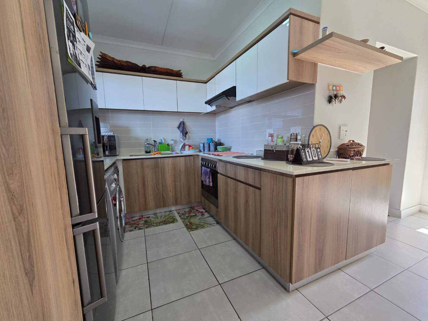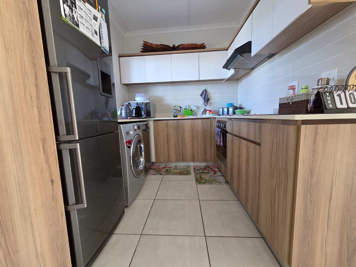 The well-appointed kitchen has ample cupboard space, and the fridge, dishwasher and washer/dryer are standard features.