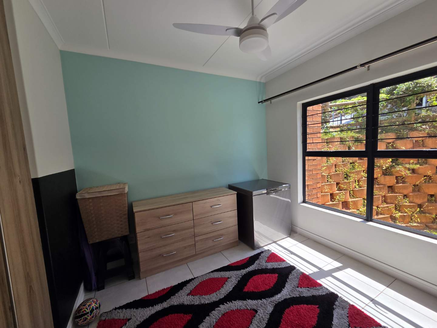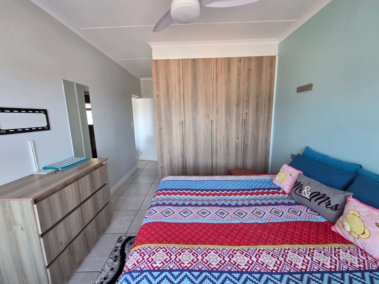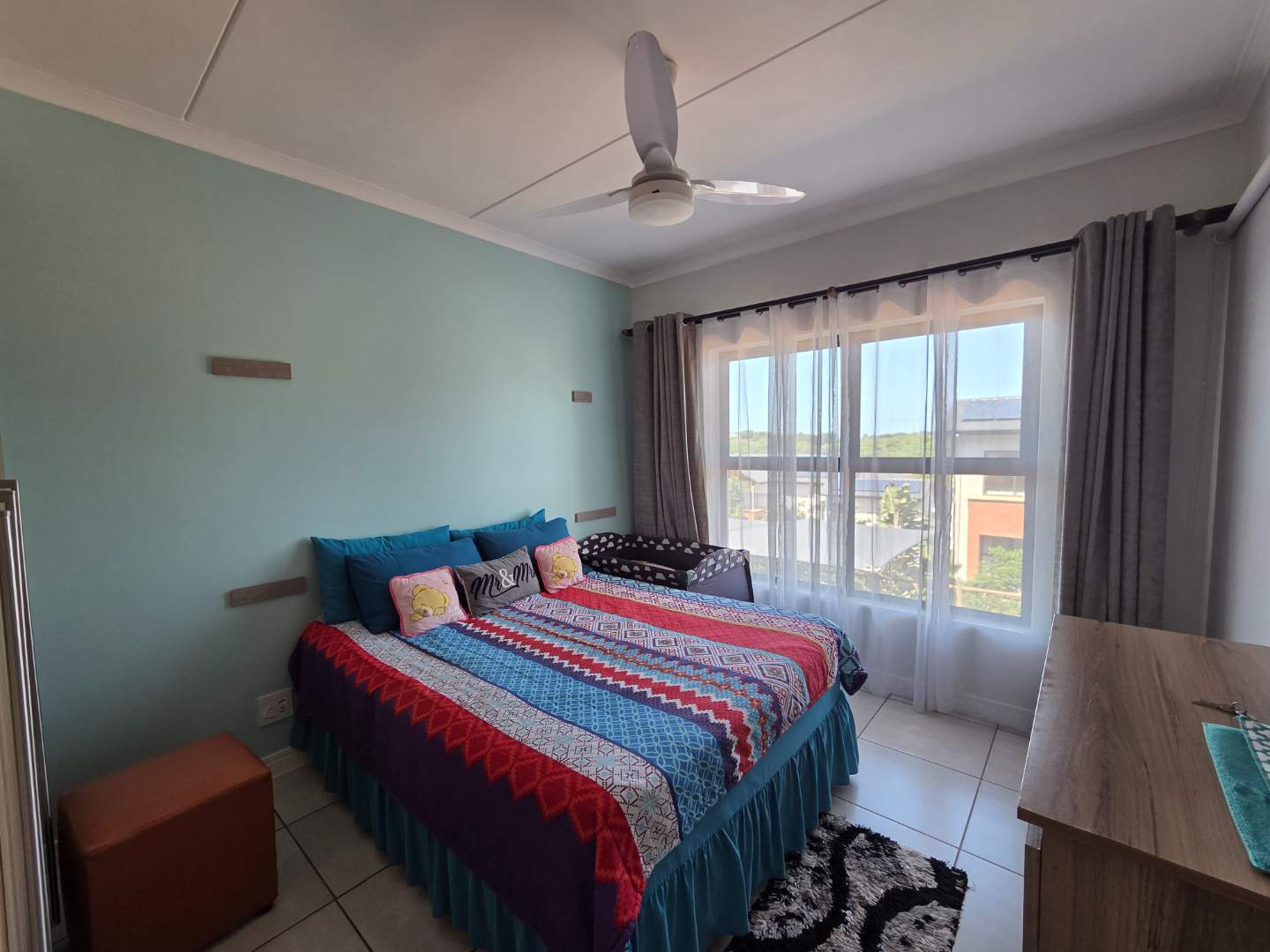 All three bedrooms feature ceiling fans and plenty of cupboard space, and the main bedroom has direct access to the balcony, and an en-suite bathroom with a shower.