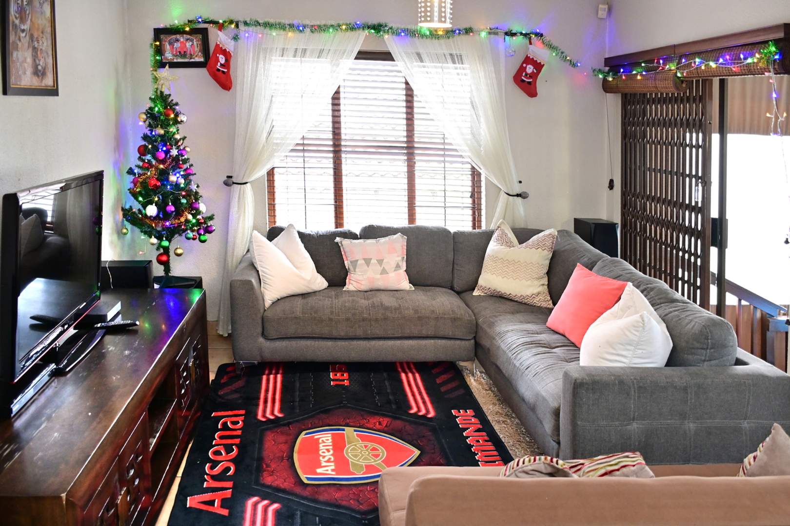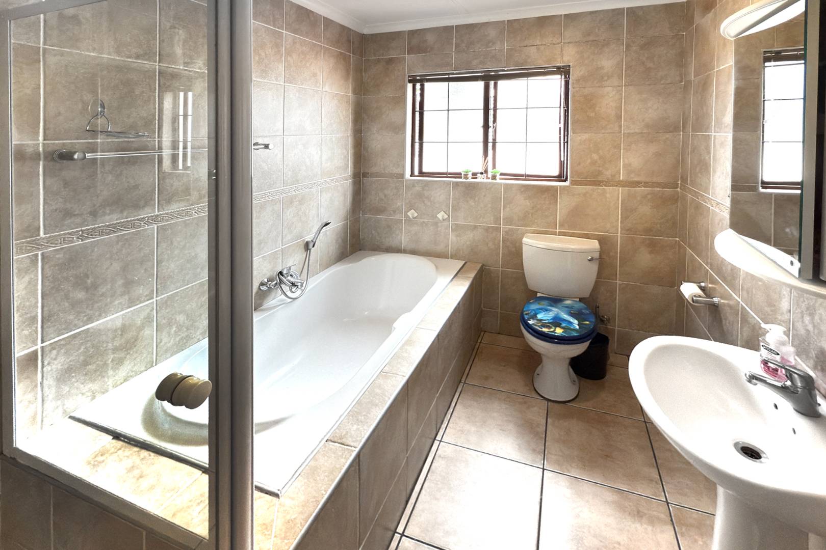 As you enter through the welcoming entrance hall, you are greeted by a spacious lounge equipped with air-conditioning, ensuring a cool and inviting atmosphere year-round.