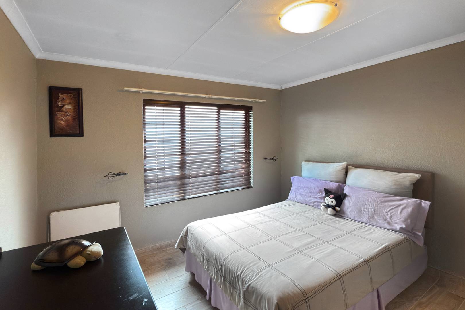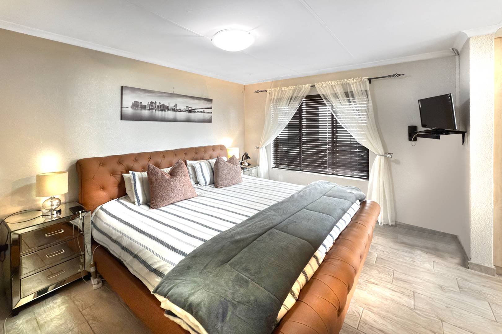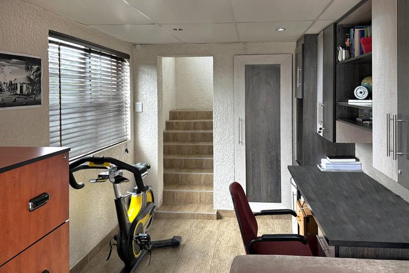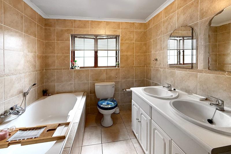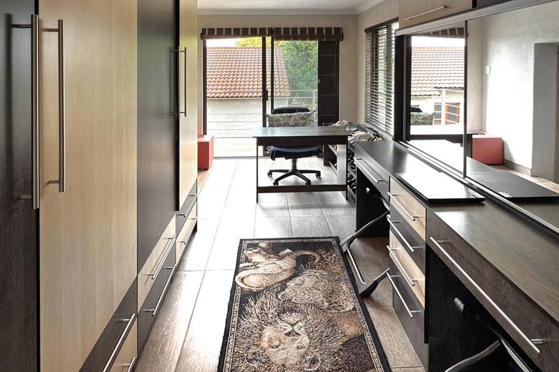 The open-plan kitchen and dining area with double volume ceilings are a chef's delight, featuring ample cupboard space and elegant granite countertops. The separate scullery adds convenience with room for two appliances and easy access to the courtyard, making meal prep and entertaining a breeze.