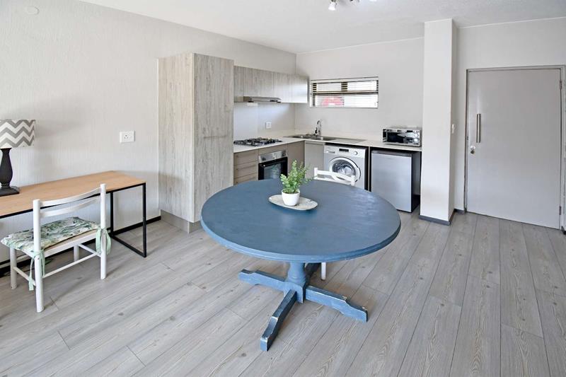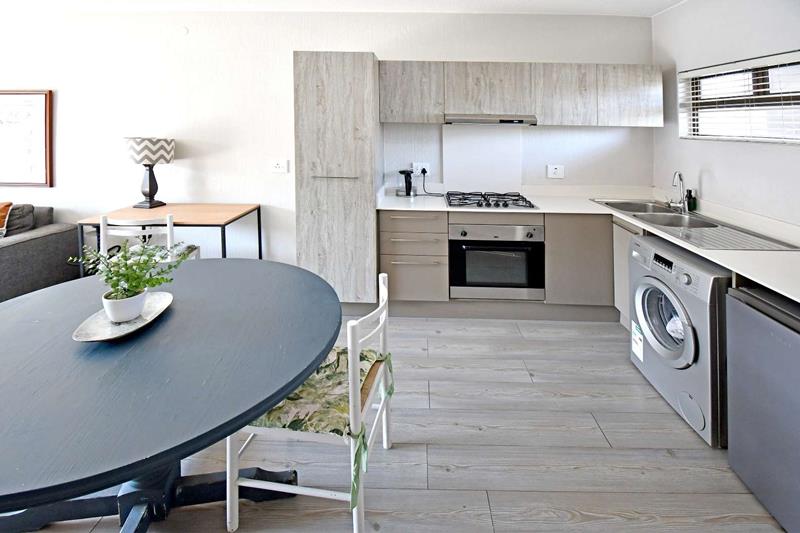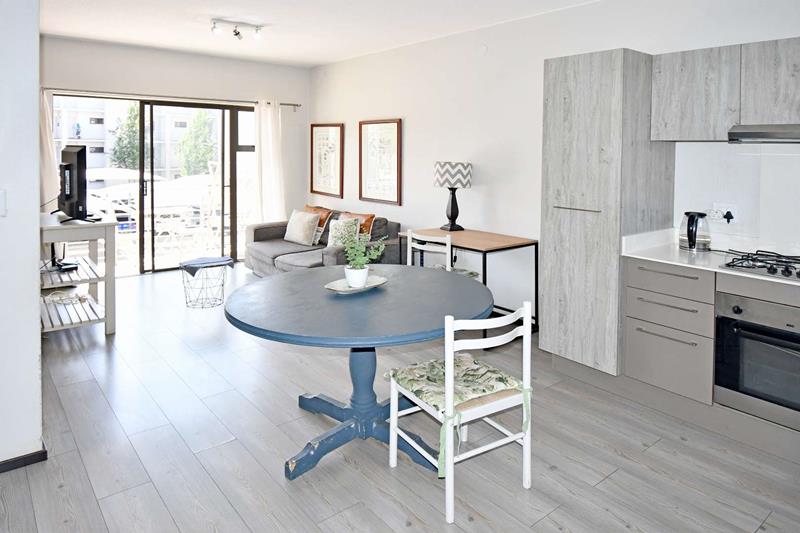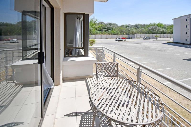 The apartment features an open-plan layout with a modern kitchen fitted with quality finishes and ample cupboard space, seamlessly flowing into the lounge and dining area. The living space extends onto a private balcony—perfect for enjoying your morning coffee or a bit of fresh air.