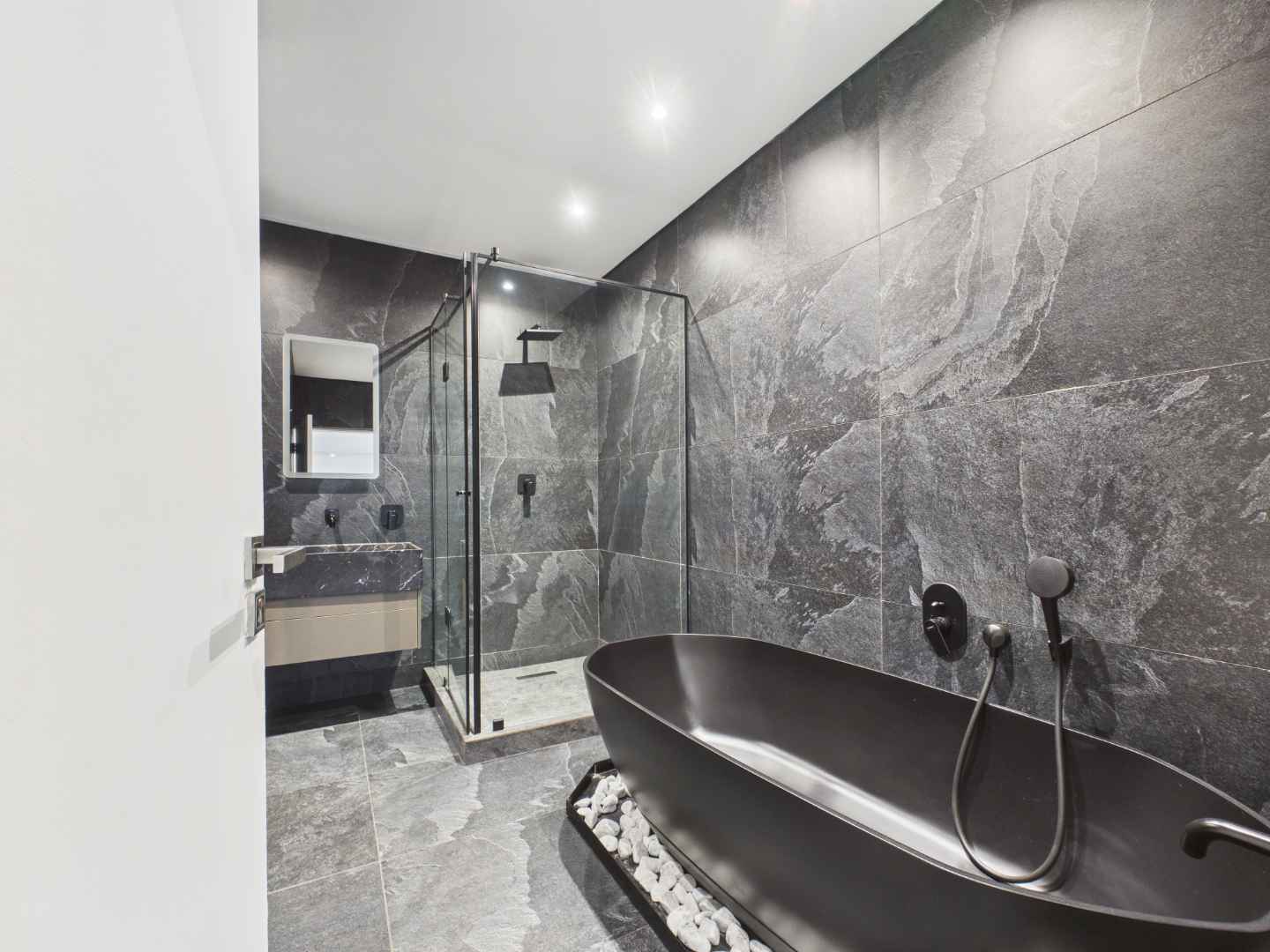 Both bedrooms are generously sized, with the main bedroom offering a stylish en-suite bathroom fitted with a shower. The second bathroom is well-appointed and includes both a bath and shower ideal for guests or family living.