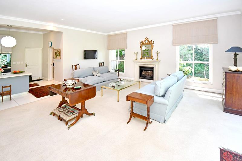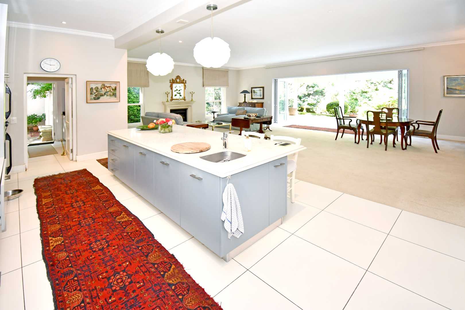A welcoming entrance flows into expansive open-plan living spaces, enhanced by abundant natural light and a warm, inviting atmosphere. The elegant living area features a wood-burning fireplace, creating a cosy focal point for relaxed evenings and stylish entertaining. At the heart of the home is a designer kitchen with a striking oversized centre island, premium finishes, and a separate scullery, perfectly suited to contemporary living.