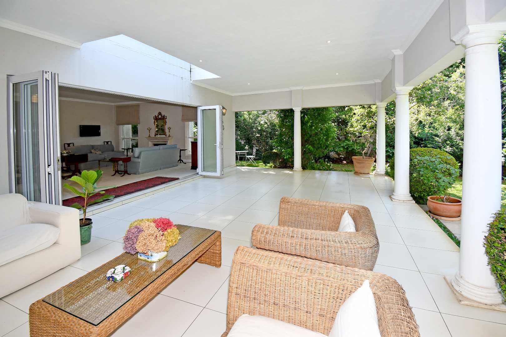 Stacking doors open the living areas onto a massive covered patio, creating a seamless extension of the home and an ideal setting for entertaining guests or enjoying tranquil outdoor living. A private swimming pool further enhances the lifestyle appeal.