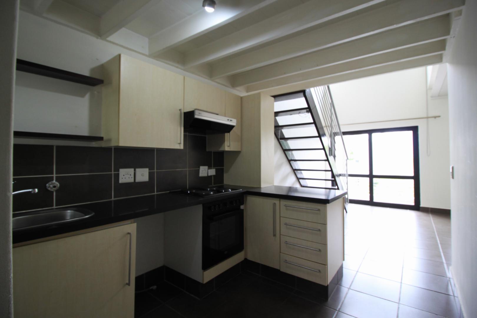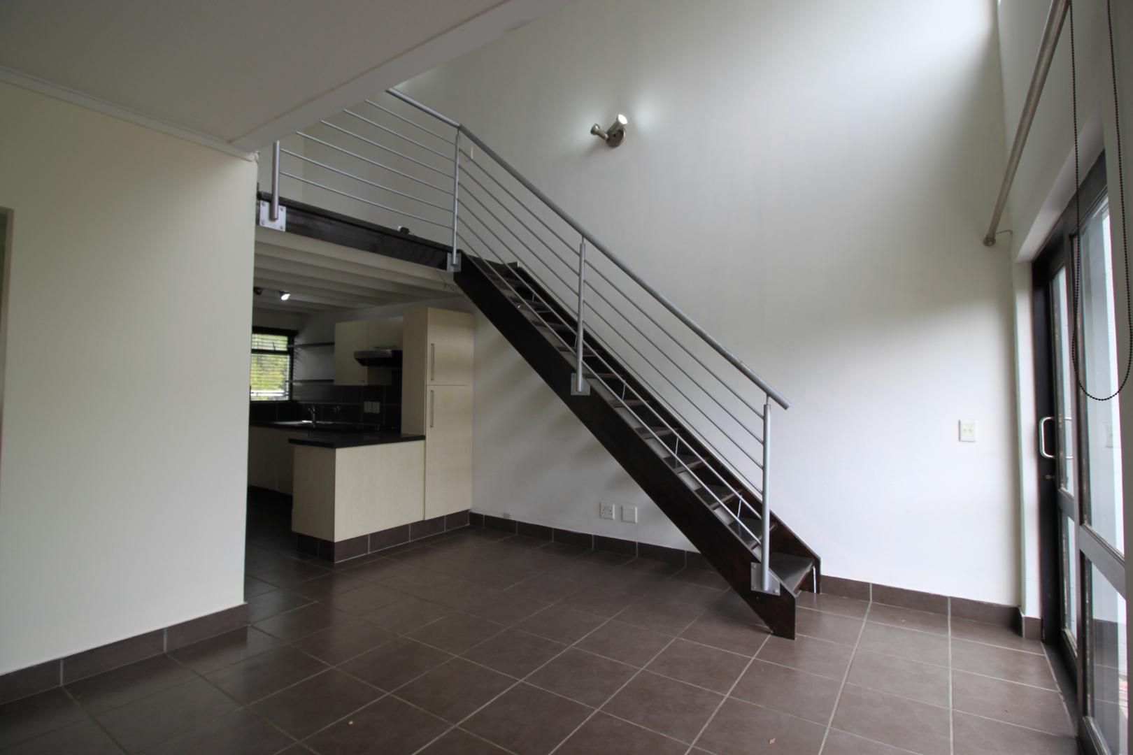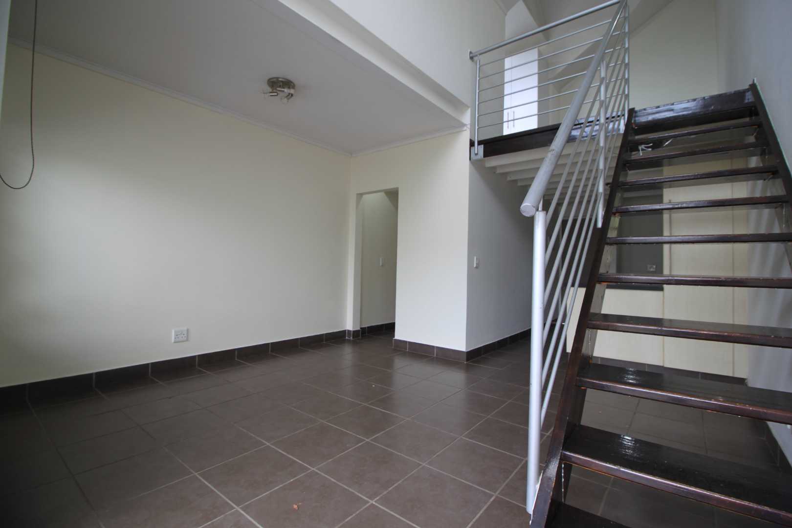 The kitchen has space for 1 under counter appliance and leads through to the tiled living area, that has stunning double volume ceilings.