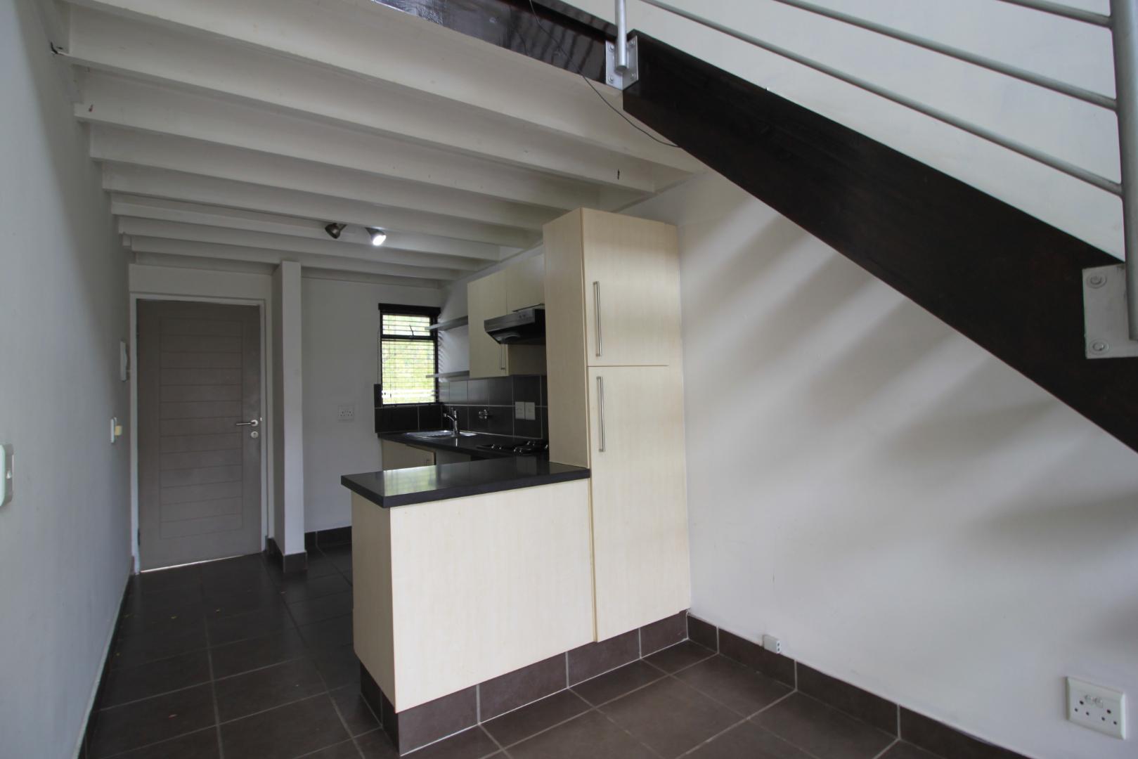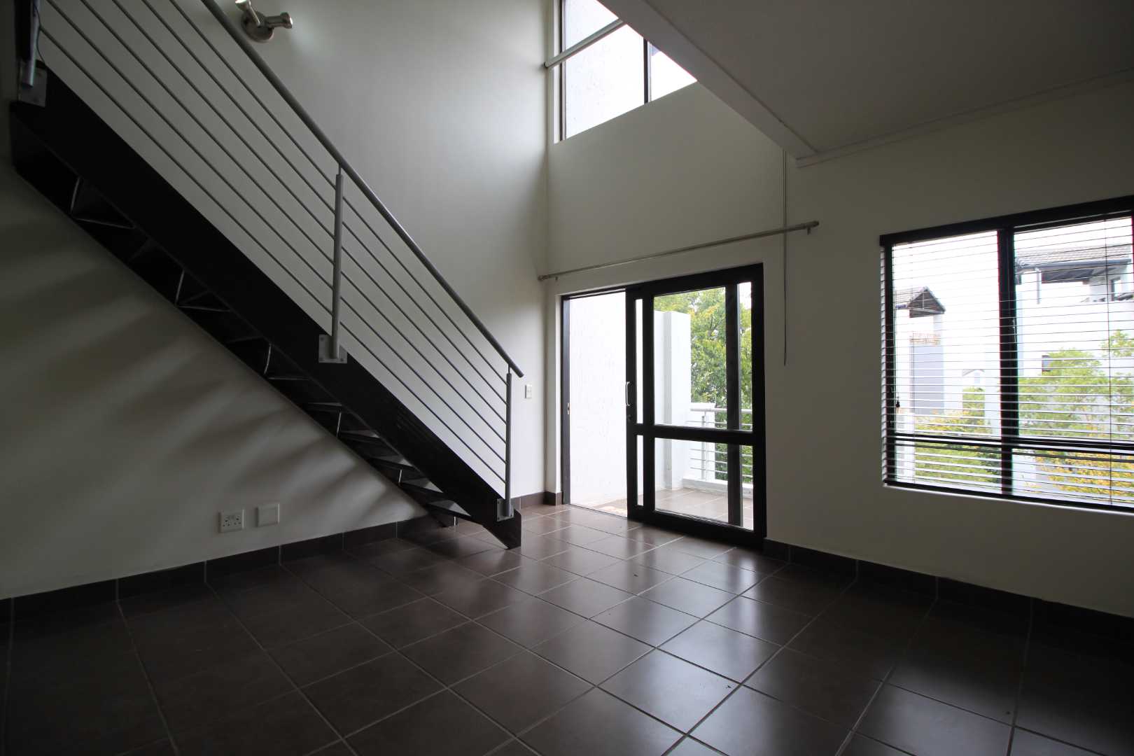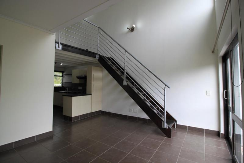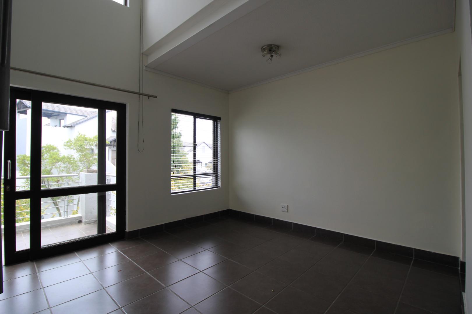 The kitchen has space for 1 under counter appliance and leads through to the tiled living area, that has stunning double volume ceilings.