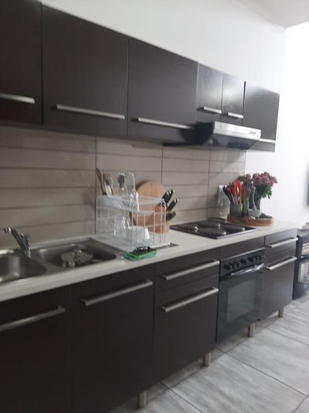 The modern kitchen is well-appointed with an electric oven, hob, and extractor fan. Caesarstone countertops, ample cupboard space, and provisions for a fridge and one undercounter appliance complete this functional and elegant space.