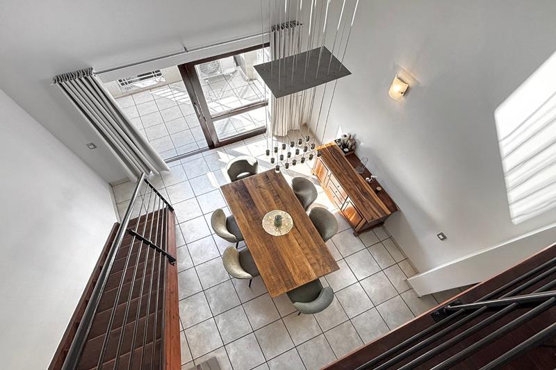 The double-volume dining room seamlessly flows onto the first balcony, perfect for sipping your morning coffee or simply enjoying a quiet evening outdoors.