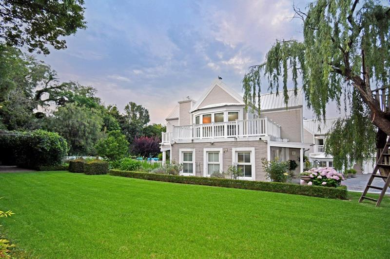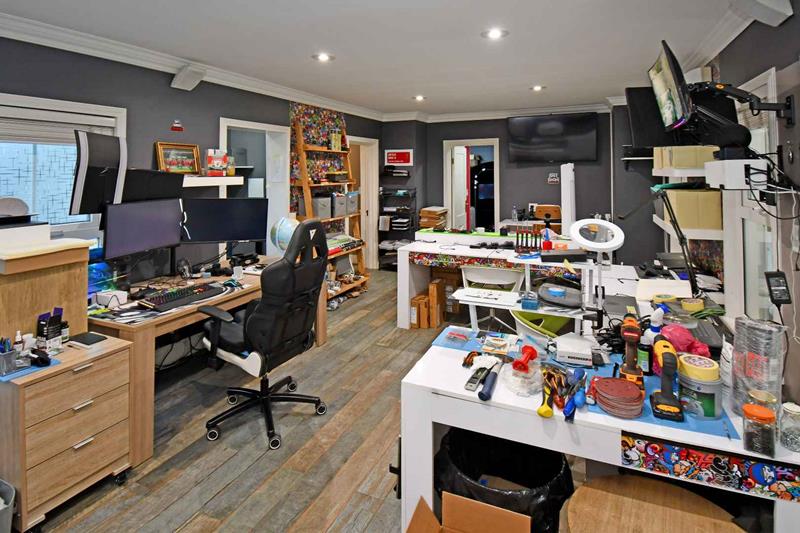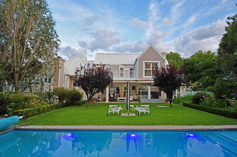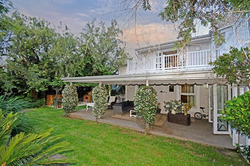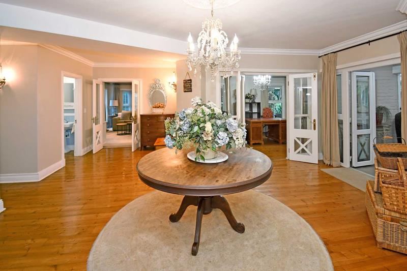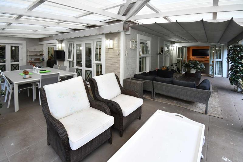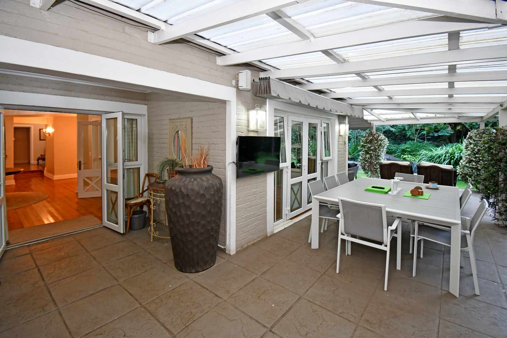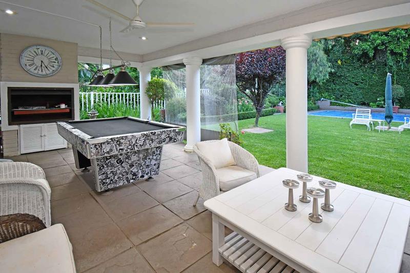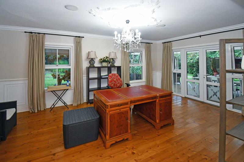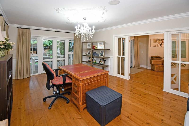 A versatile entertainment wing on the ground level (currently used as an office, with kitchenette, toilet and separate room) opens onto a covered patio with a built-in braai, overlooking the manicured garden and large heated swimming pool. This space can easily serve as a cottage, games room, man cave, studio or work-from-home suite.