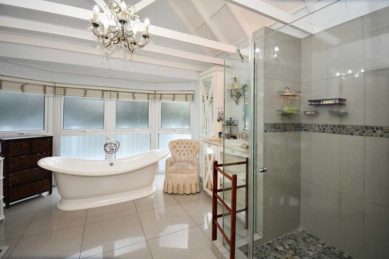 The alfresco dining area, wrapped in grape vines beneath a pergola includes a gas braai and pizza oven. This is the perfect space for long lazy lunches or evening gatherings.