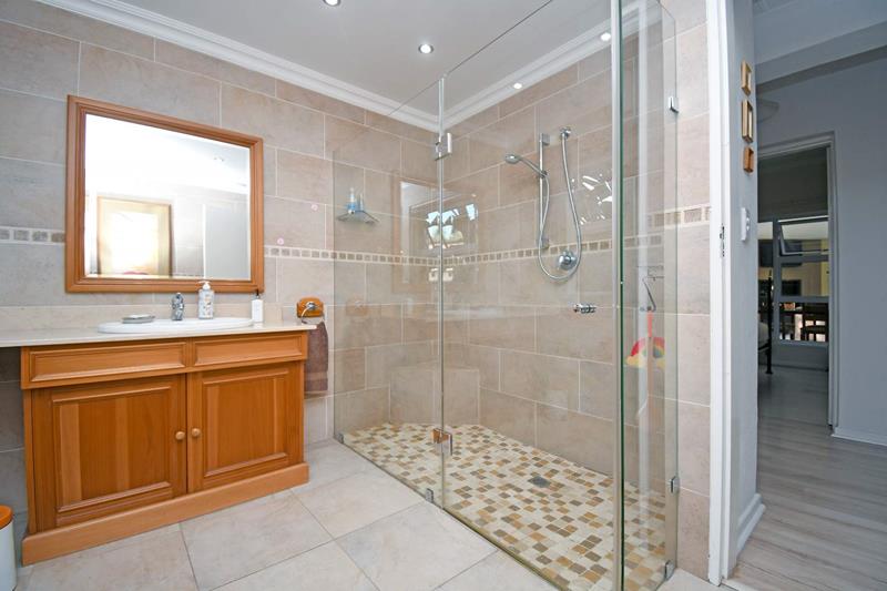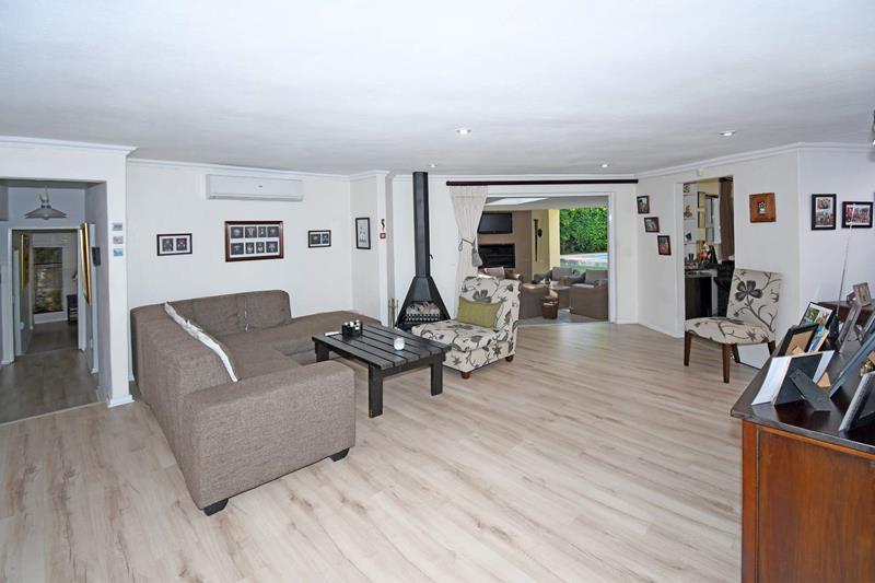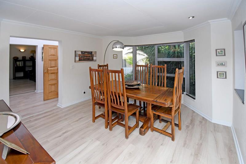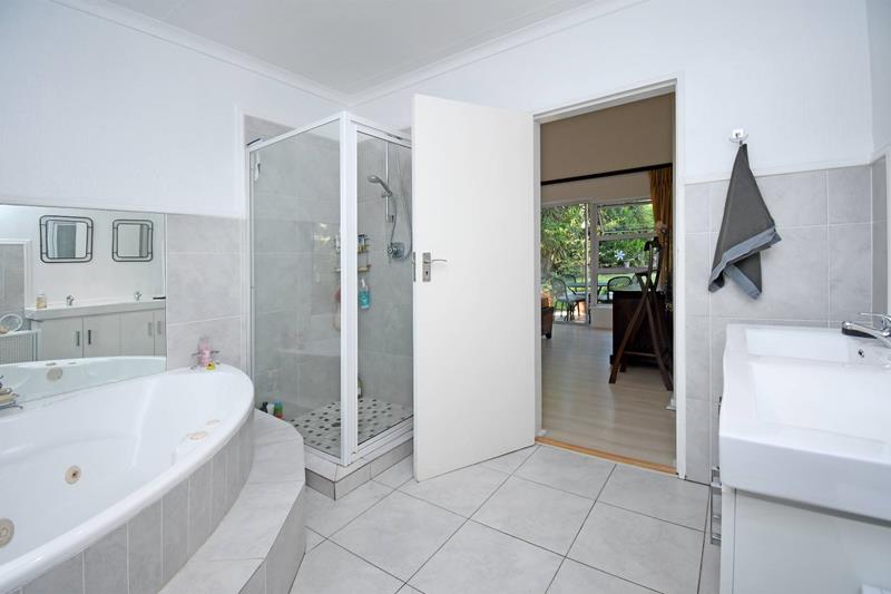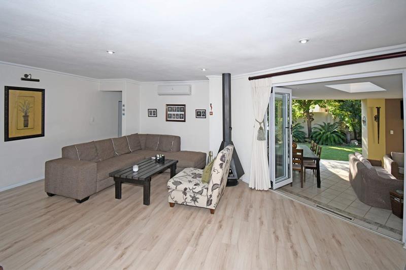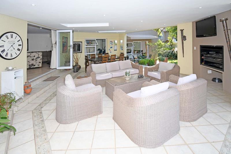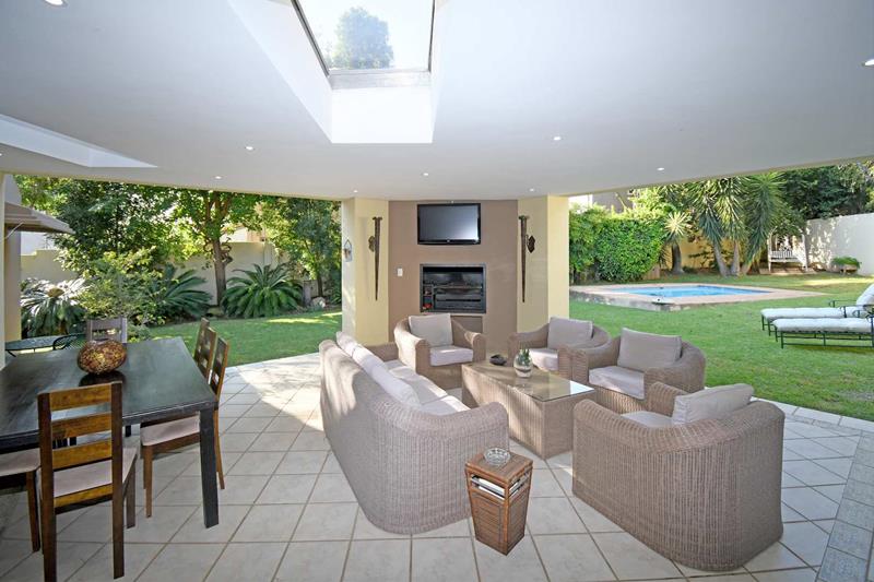 The covered patio provides ample space for family gatherings with built in braai, this opens onto the large garden with swimming pool and loads of green space for kids to play.