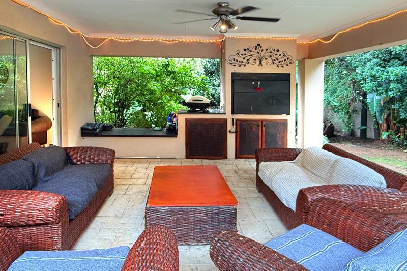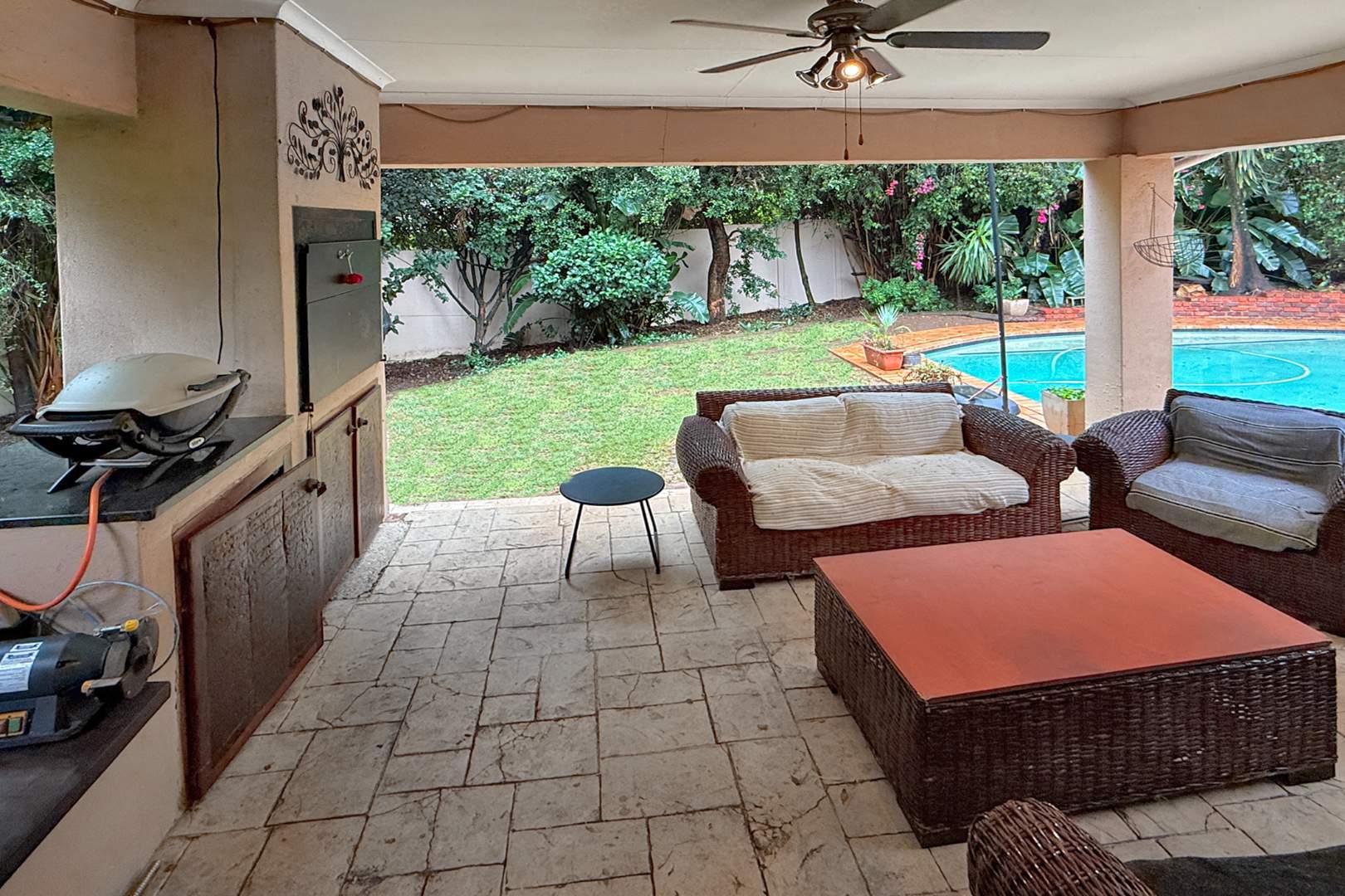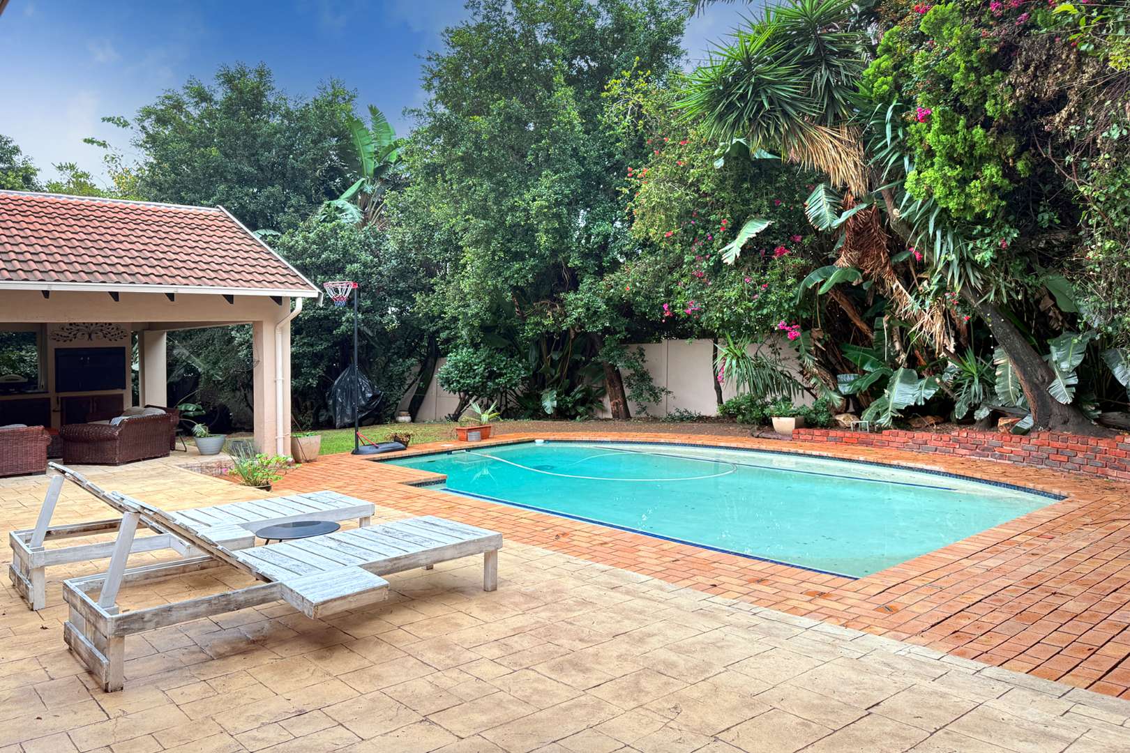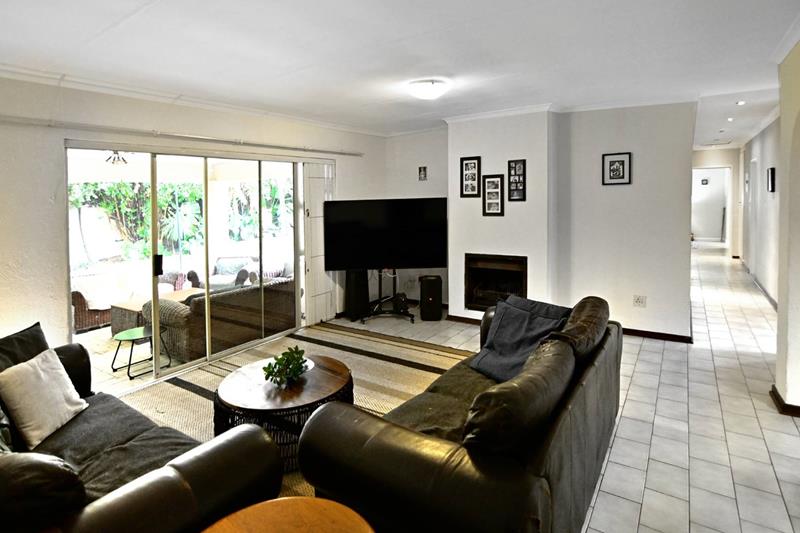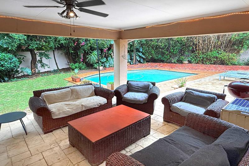 The second lounge seamlessly transitions to a covered patio, which overlooks the beautifully manicured back garden, where you can unwind by the sparkling pool, creating an ideal setting for entertaining or simply enjoying a quiet afternoon in the sun.