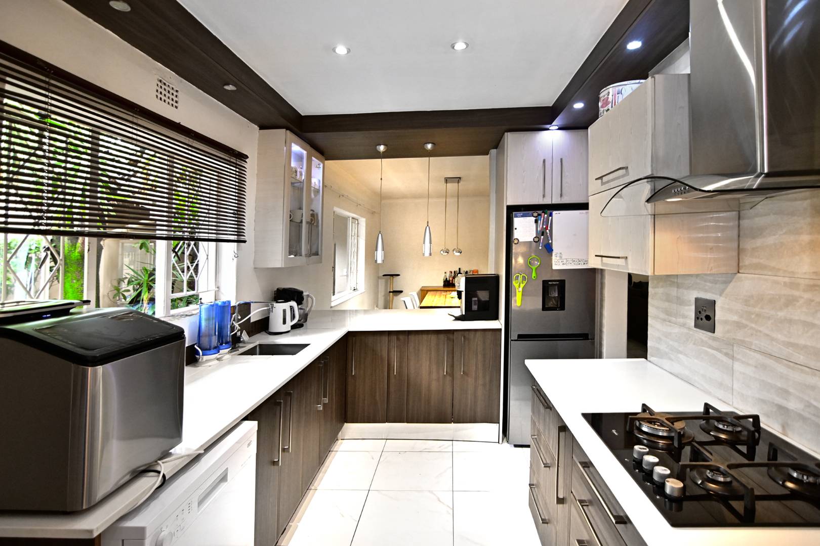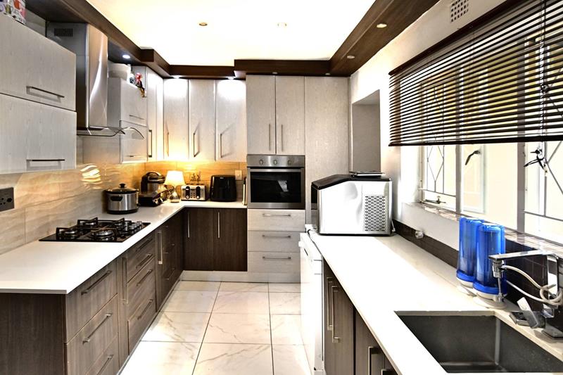 Right by the living area is an open-plan dining area, which effortlessly connects to a modern kitchen featuring elegant Caesar stone countertops and a gas stove, perfect for culinary enthusiasts.