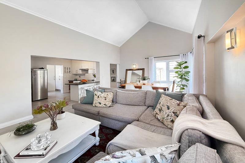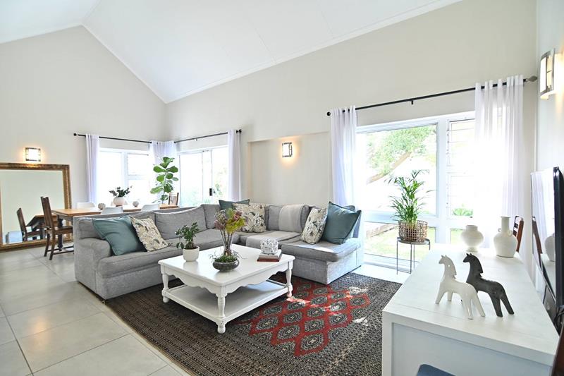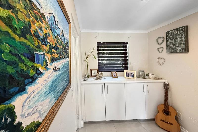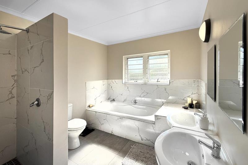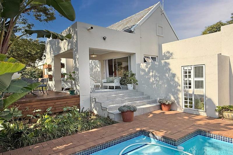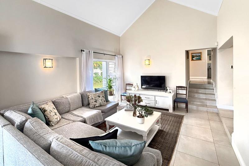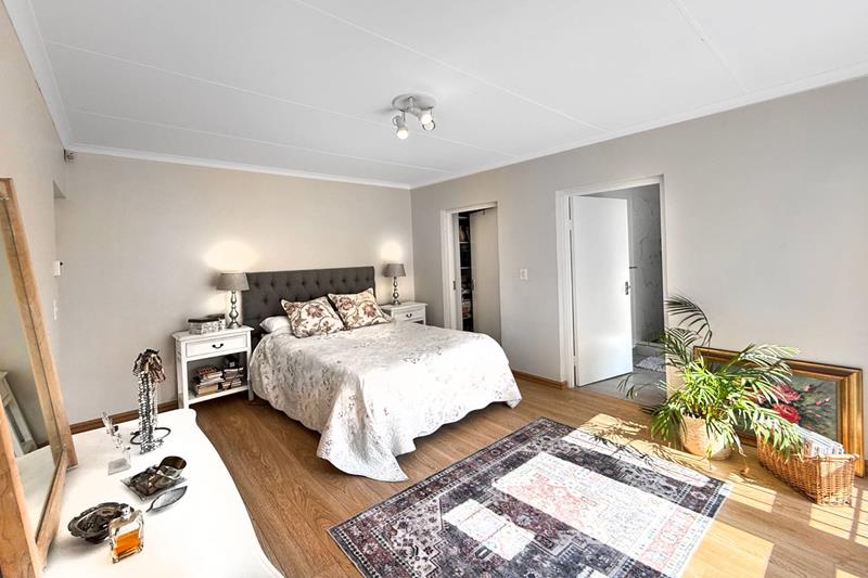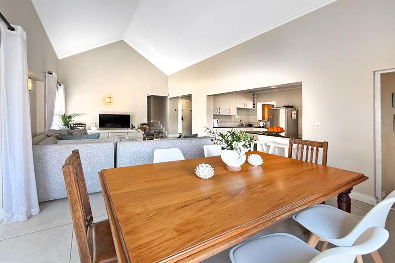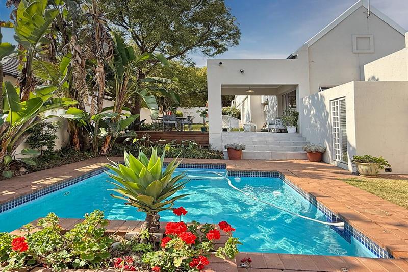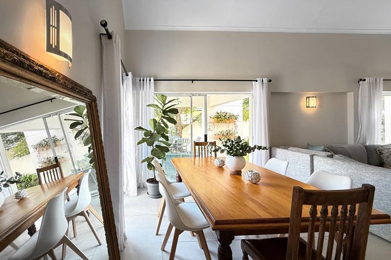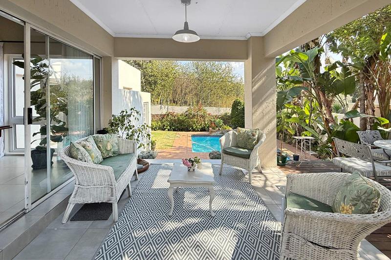 The entrance hall welcomes you into an expansive open-plan double volume living area, seamlessly flowing into a sophisticated dining room. This inviting space extends to a covered patio, perfect for entertaining or enjoying quiet evenings overlooking the beautifully landscaped garden and sparkling pool. Imagine hosting summer braais or having relaxing sundowners by the water. This home is designed for both leisure and luxury.