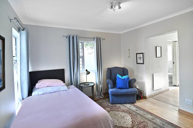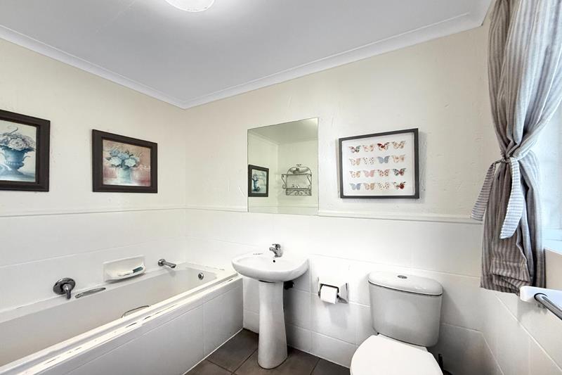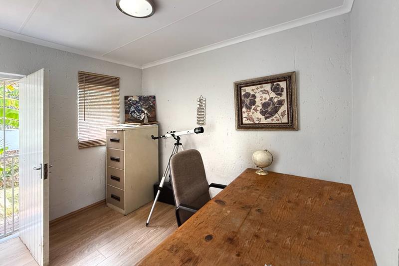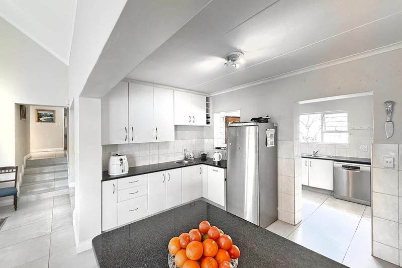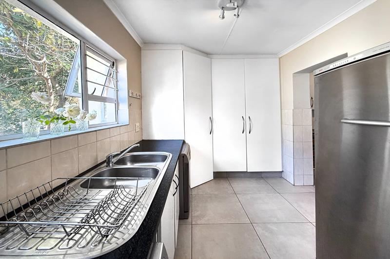 There is a well-appointed kitchen, featuring a separate scullery that offers ample cupboard space and room for three appliances, which leads out to a courtyard with a veggie garden, complete with a peach and avocado tree.