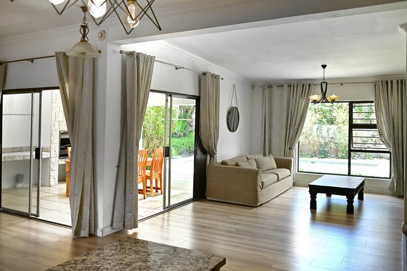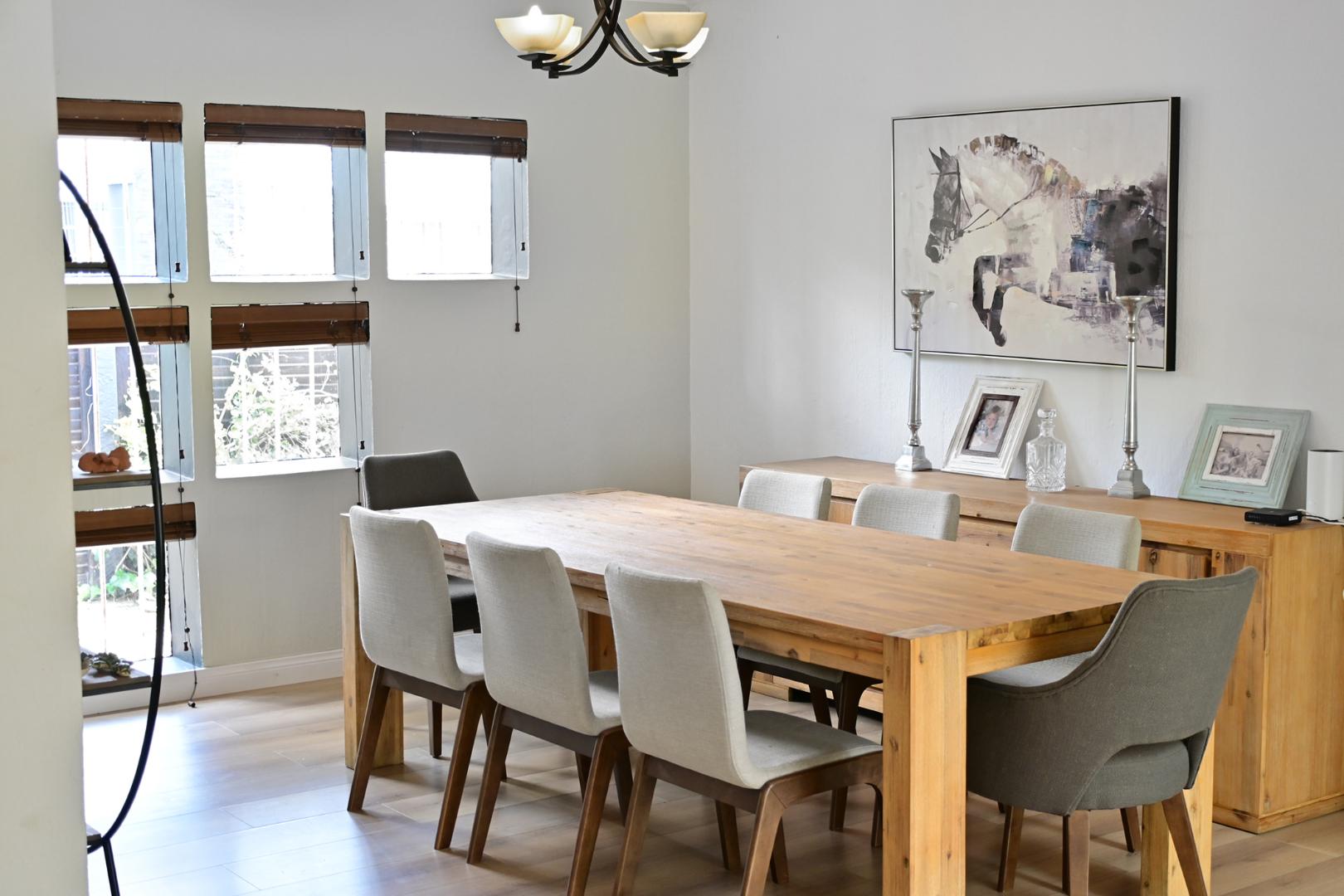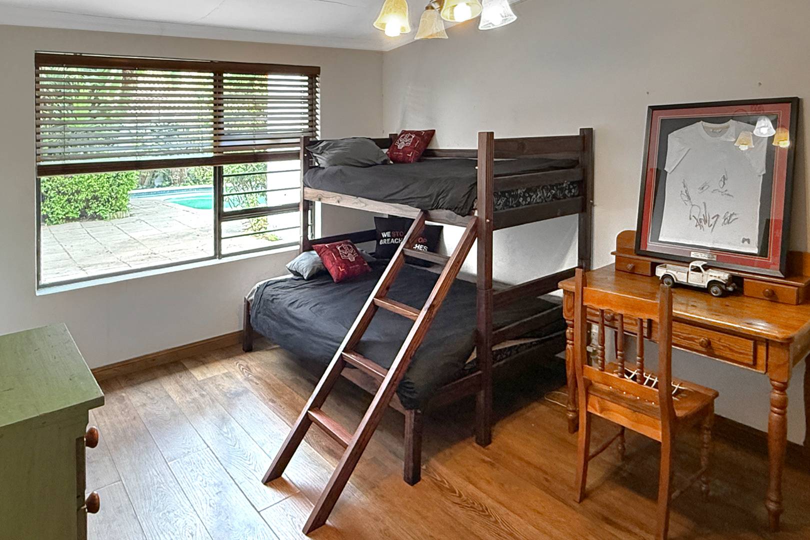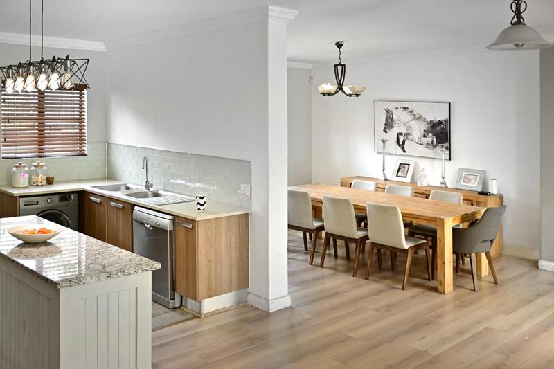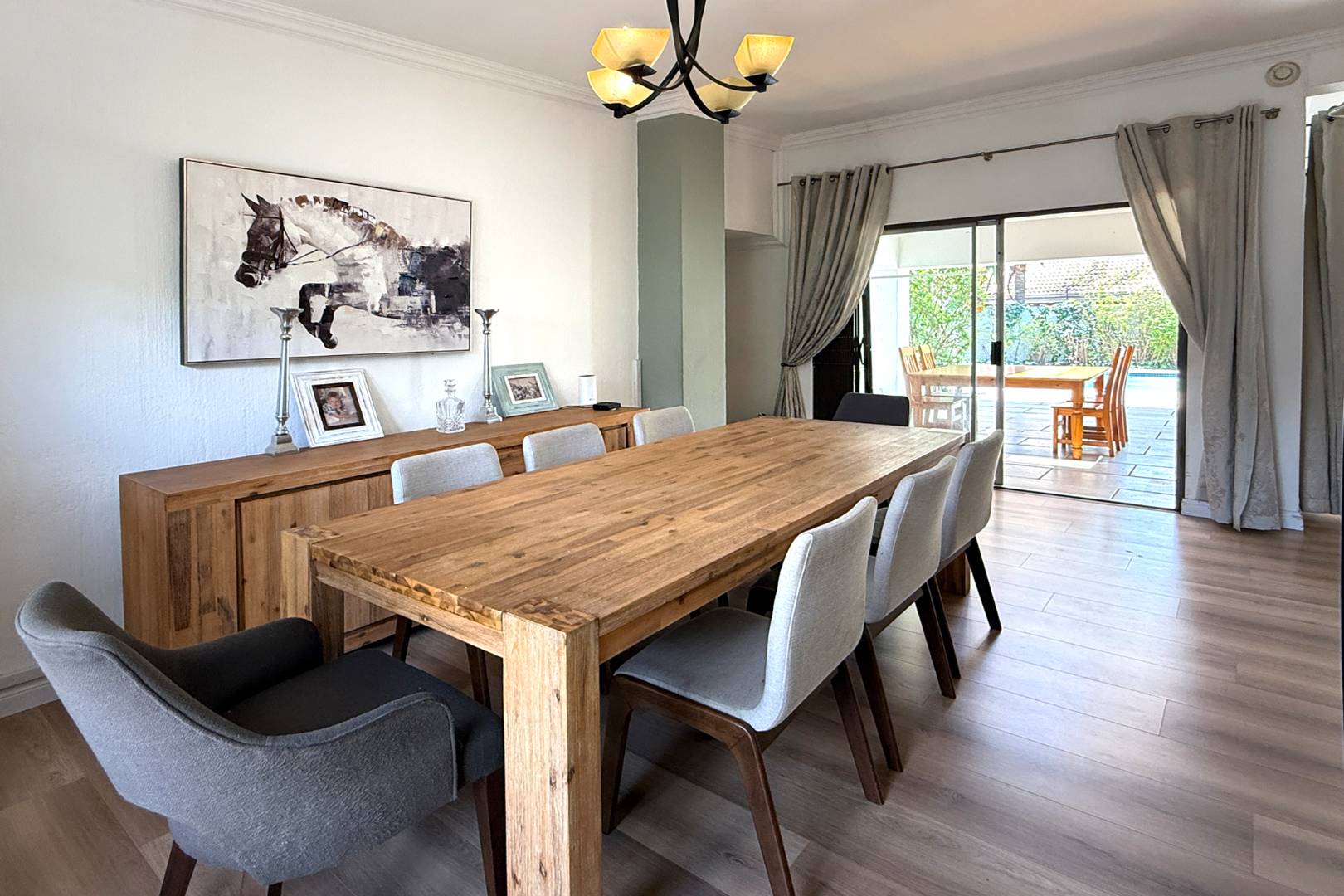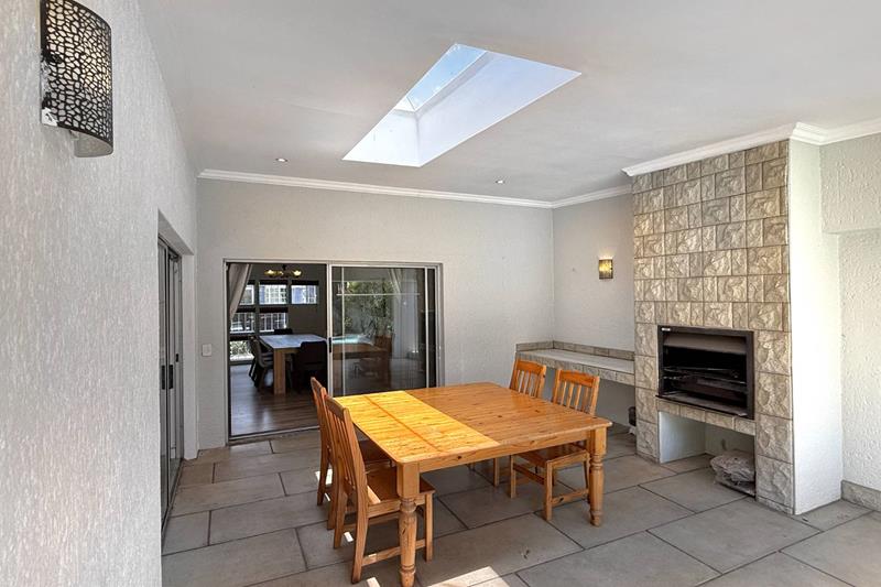 The dining room flows effortlessly to a covered patio, where you can enjoy alfresco dining while overlooking the beautifully landscaped garden and sparkling pool. Imagine summer days spent lounging by the pool or hosting braais with family and friends in this idyllic outdoor space.
