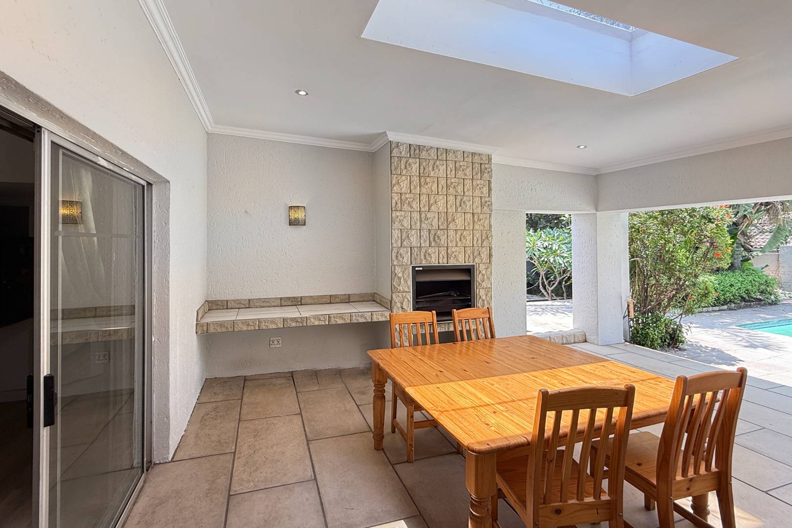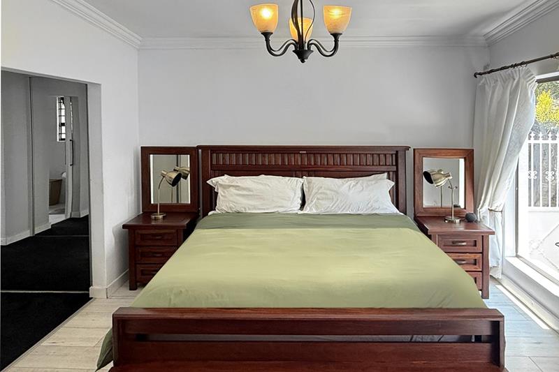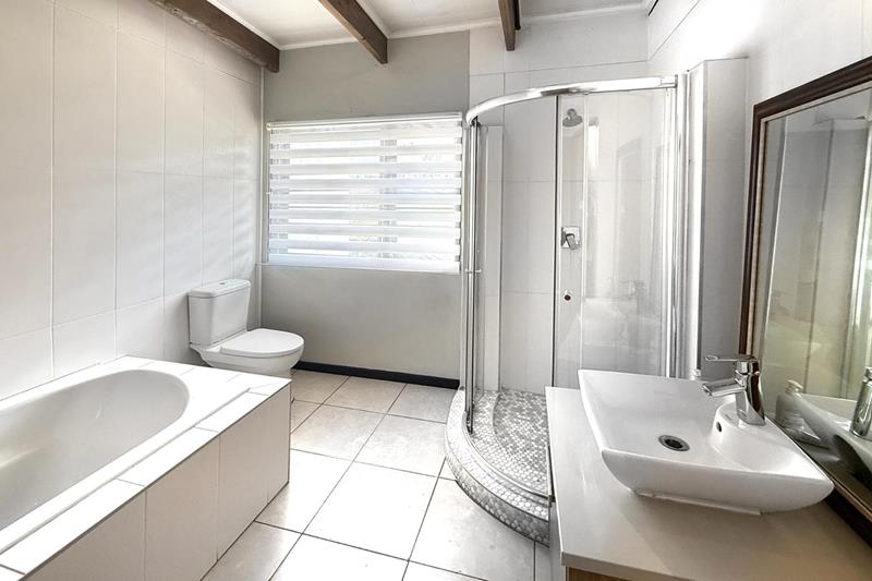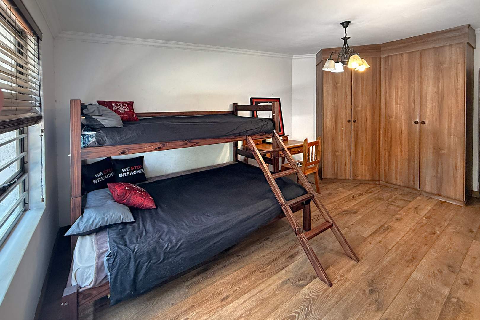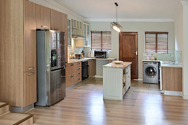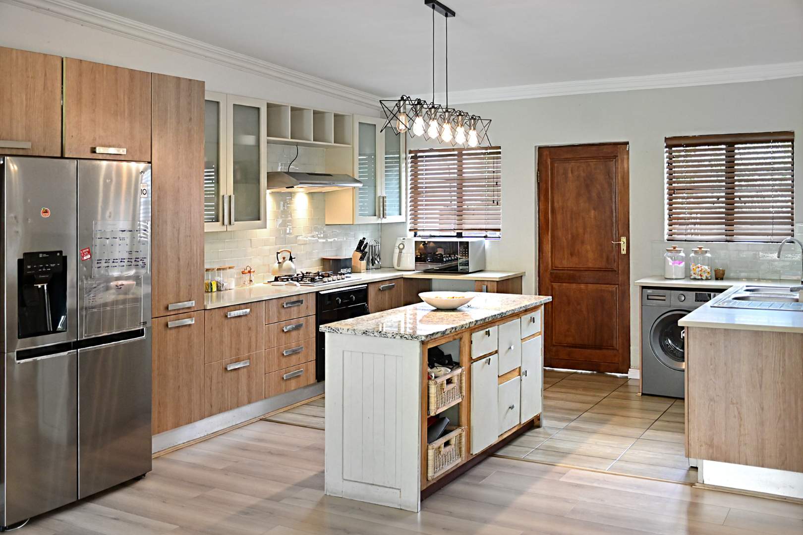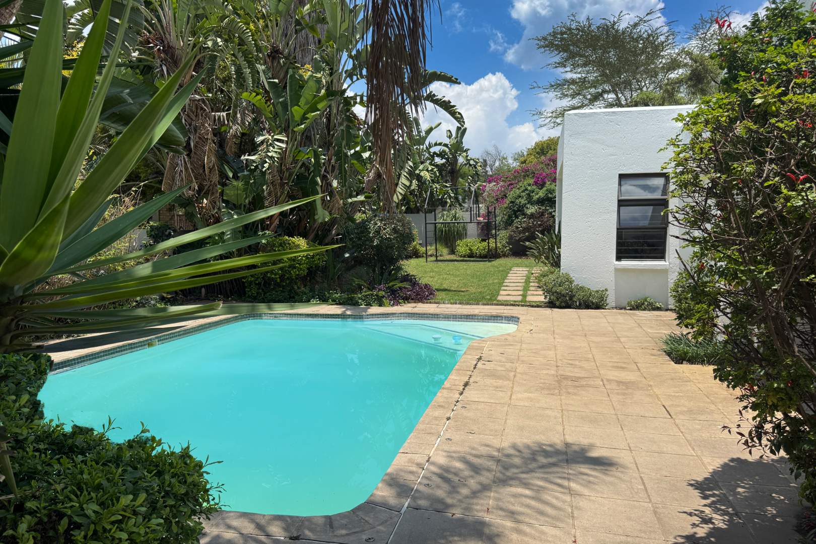 The dining room flows effortlessly to a covered patio, where you can enjoy alfresco dining while overlooking the beautifully landscaped garden and sparkling pool. Imagine summer days spent lounging by the pool or hosting braais with family and friends in this idyllic outdoor space.
