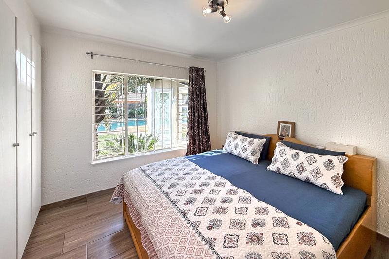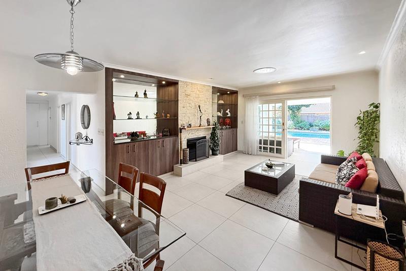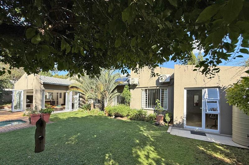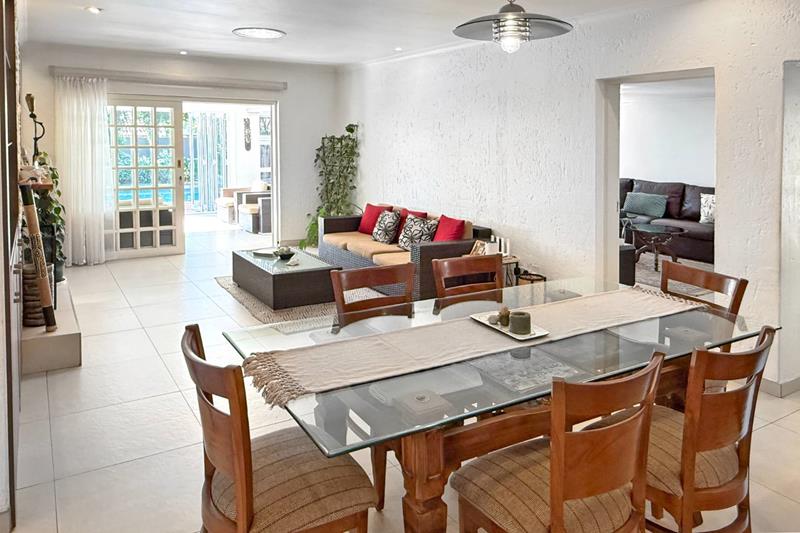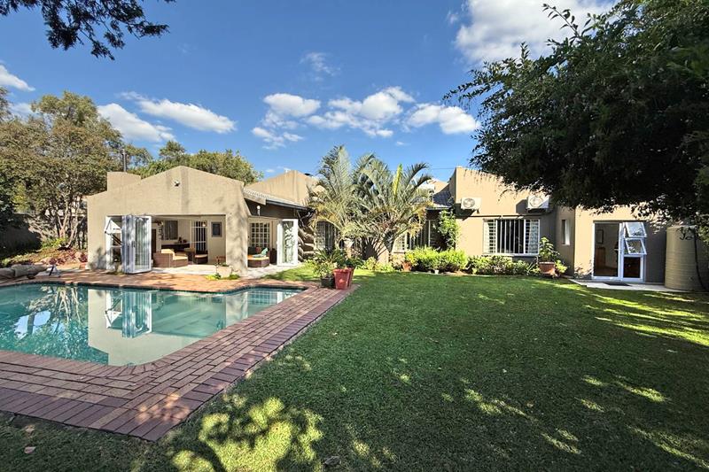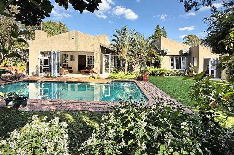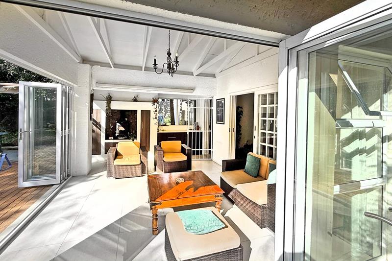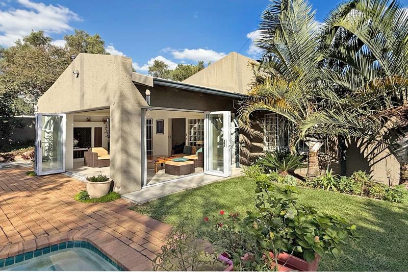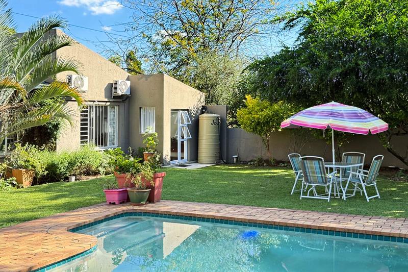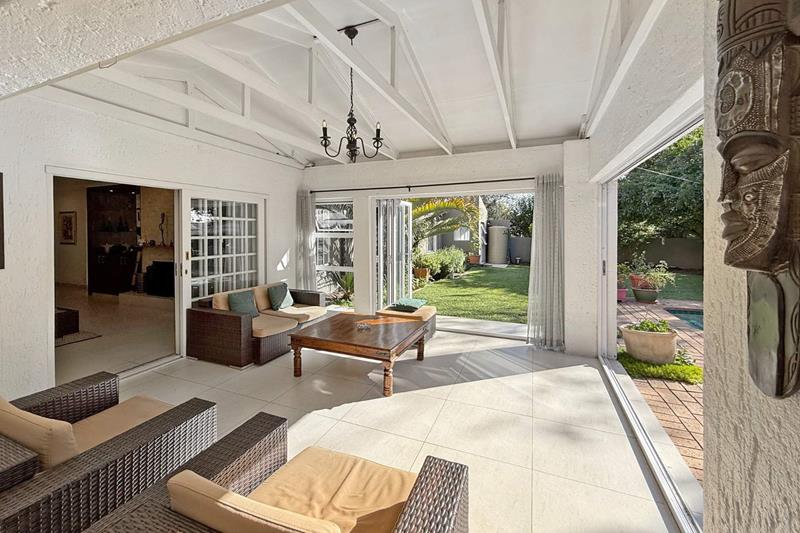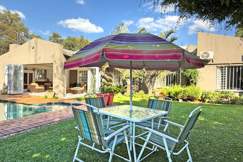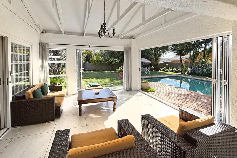 The patio overlooks the lush garden with a sparkling pool, perfect for those late evening Sundowners.