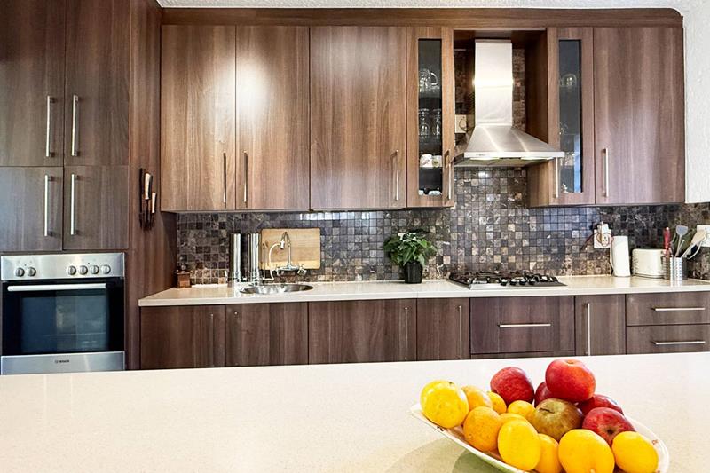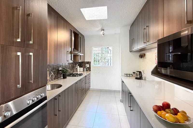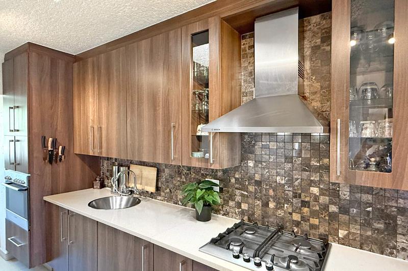 The immaculate kitchen, where culinary delights await with a premium gas stove, elegant Caesar stone countertops, and an abundance of cupboard space. The separate scullery with space for three appliances ensures that your kitchen remains clutter-free.