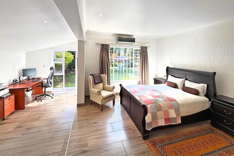 Retreat to the luxurious main bedroom, a true sanctuary boasting a dressing room area, air conditioning, and a dedicated study corner for those who work from home. The modern full en-suite bathroom adds a touch of elegance, and the bedroom's private access to the lush garden enhances the sense of tranquility. The second and third bedrooms share a well-appointed family bathroom, with the third bedroom also equipped with air conditioning for added comfort. The versatile fourth bedroom is perfect for a teen pad, complete with its own kitchenette, en-suite bathroom, and private entrance, offering independence and convenience.