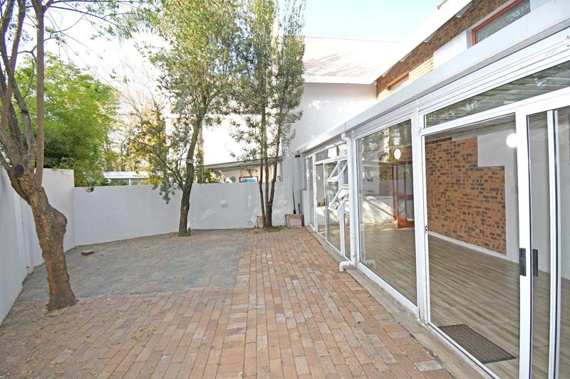 The kitchen is thoughtfully designed with sleek granite counters, generous cabinetry, and space for two under-counter appliances. It also opens onto a practical courtyard featuring additional built-in storage. A guest loo on the main level adds to the home's thoughtful layout.