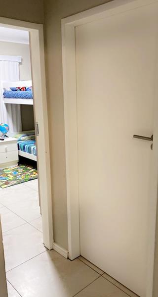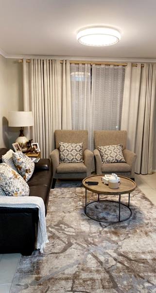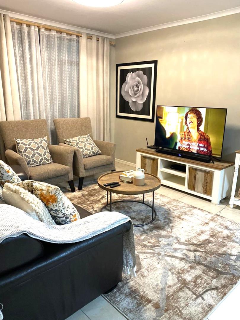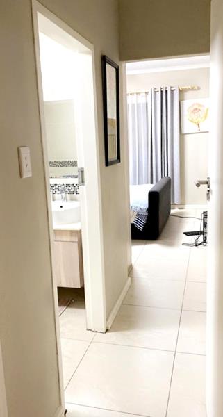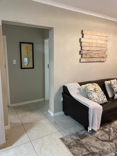 The bright and spacious tiled living area, leads out to a covered balcony