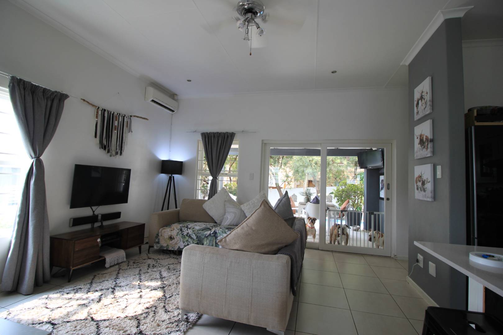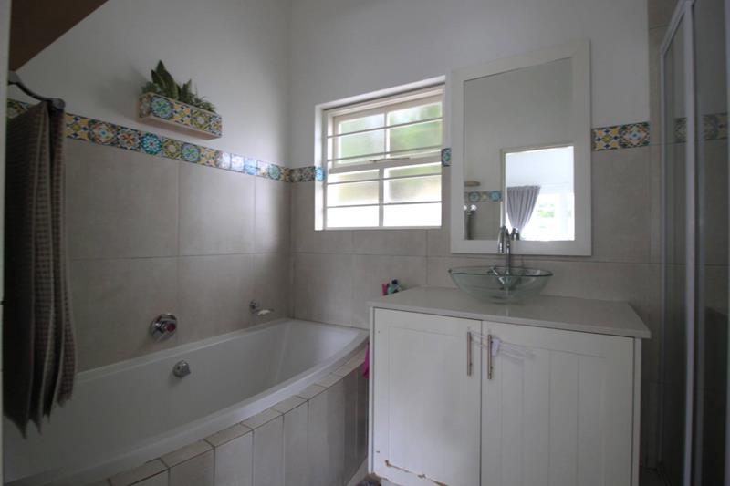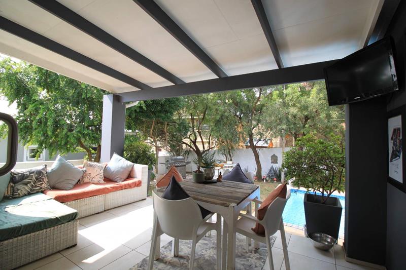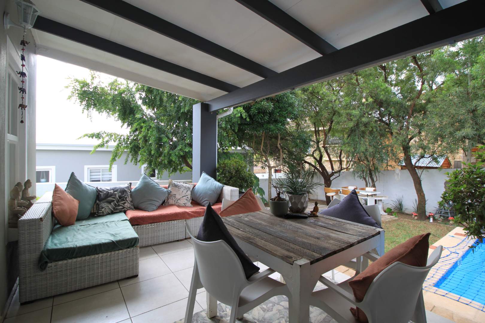 The large and spacious living area, is tiled and leads out to the covered patio, overlooking the pool and well established garden
