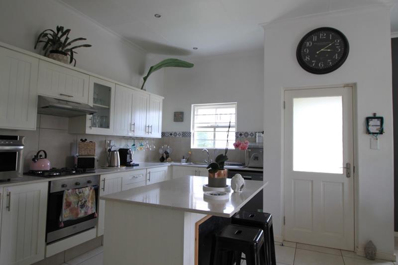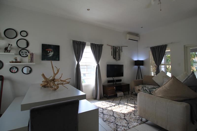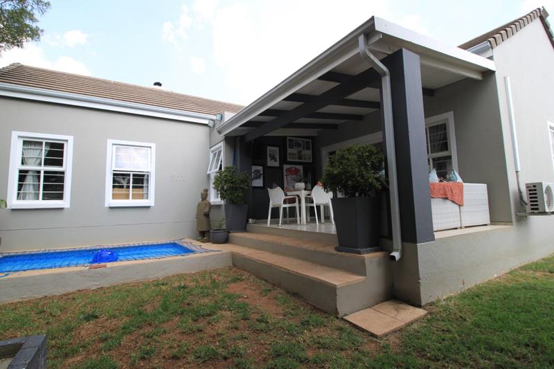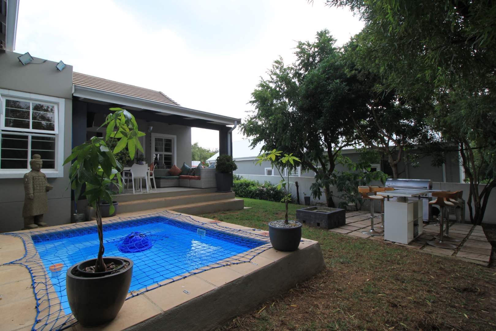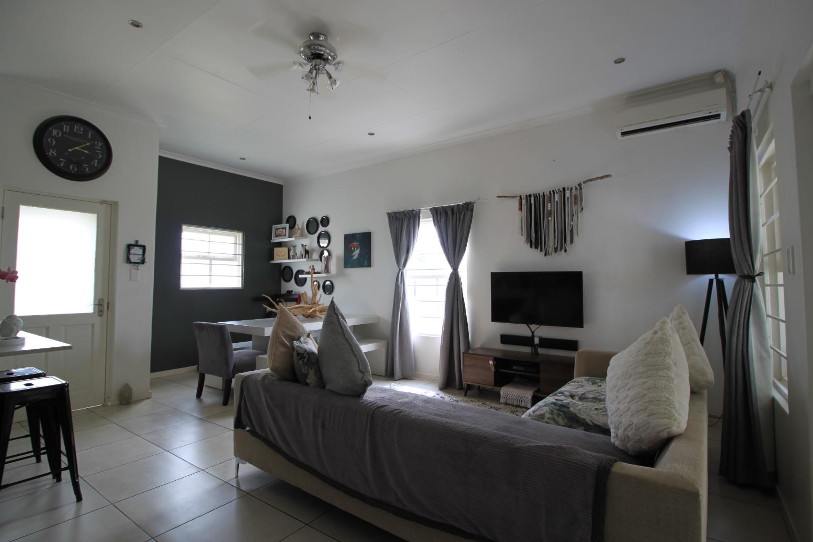 The large and spacious living area, is tiled and leads out to the covered patio, overlooking the pool and well established garden
