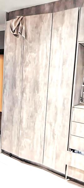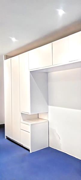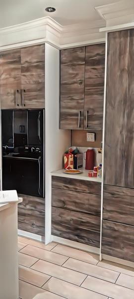 Fully equipped kitchen with modern fittings, space for a double door fridge, oven and hob.