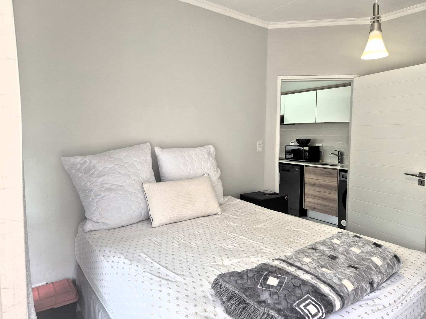 The bedroom is en-suite, and also leads out onto the balcony.