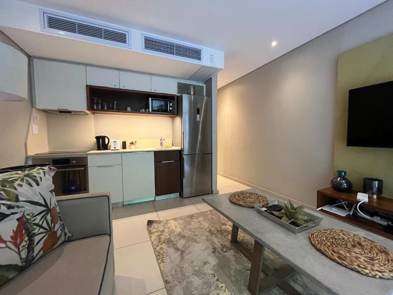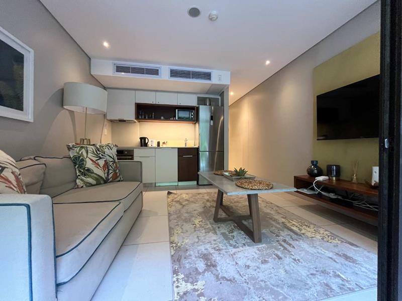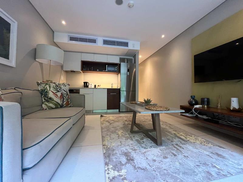 Step into a modern, open-plan layout featuring a fully fitted kitchenette, a cozy lounge area, and a spacious bedroom with built-in cupboards. The bathroom is sleek and stylish, designed with contemporary finishes. Large sliding doors open out onto a private patio, giving you direct access to the manicured gardens and tranquil surroundings of the Zimbali Coastal Resort.