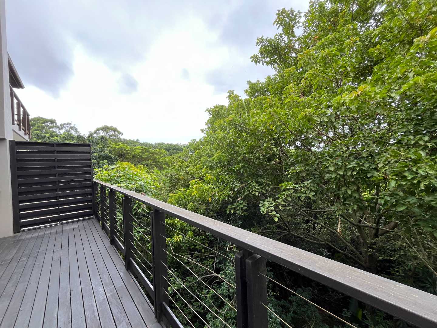 Upstairs, the master bedroom is a private retreat complete with an en-suite bathroom. The two additional bedrooms share a stylish second bathroom fitted with a frameless shower screen. Two of the bedrooms open onto a balcony, showcasing serene forest views that create a tranquil living atmosphere.