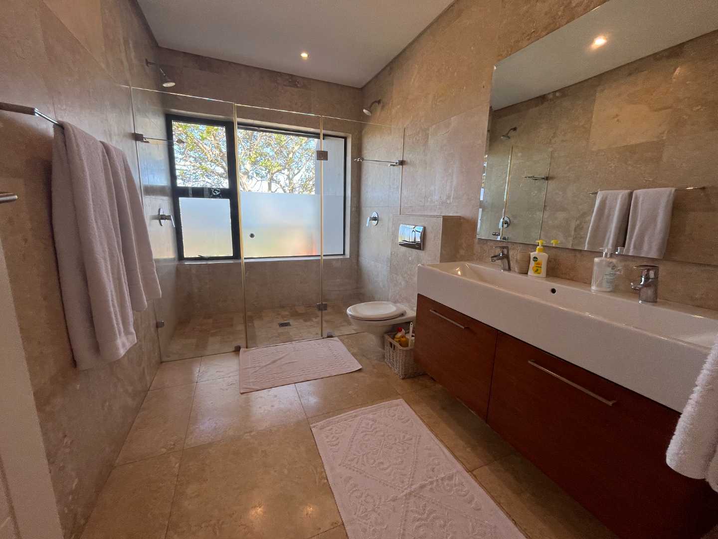 Upstairs, you’ll find three well-appointed bedrooms, including a spacious main bedroom with a full en-suite bathroom. The remaining bedrooms are generously sized and serviced by additional bathrooms, ensuring comfort for both family and guests.