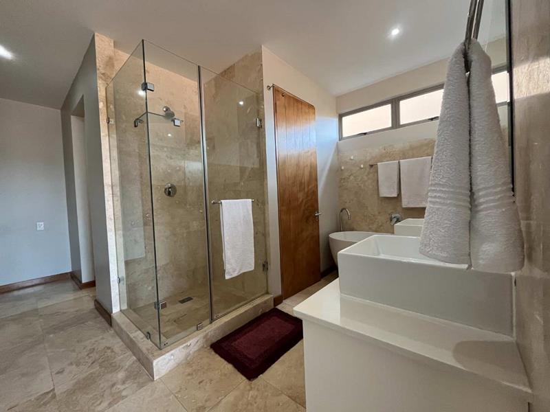 A luxurious main bedroom with a walk-in closet, a modern en-suite bathroom with his-and-hers basins, and ample natural light.