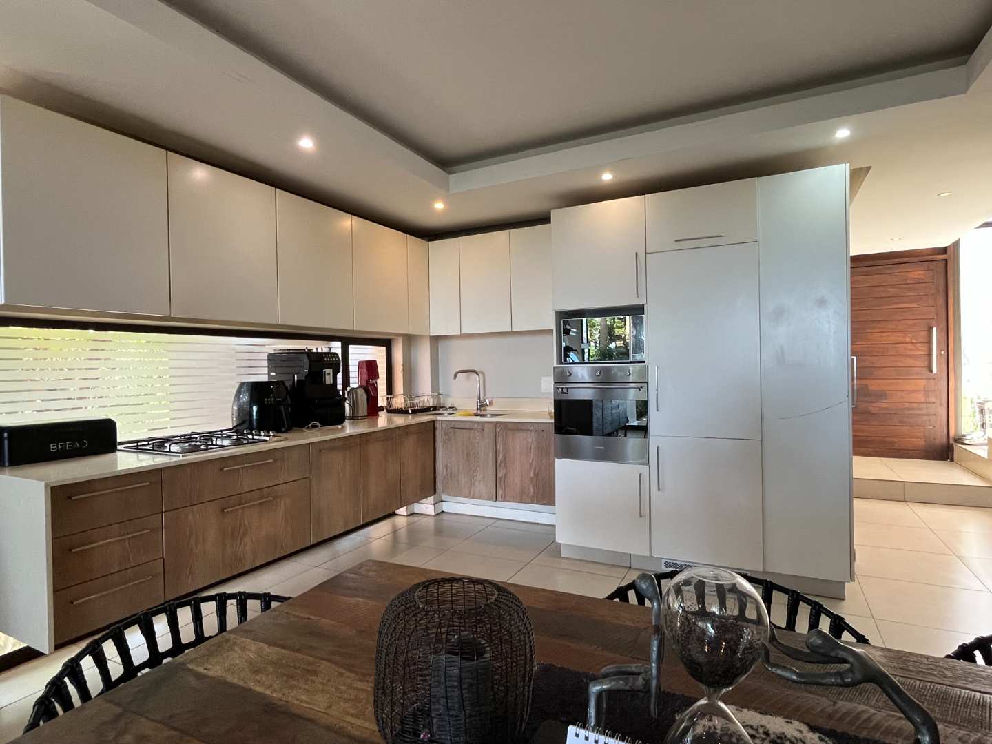 The modern fitted kitchen is complemented by a separate scullery, creating a functional and stylish space ideal for everyday living and entertaining. The split-level layout enhances the sense of space, with seamless flow between living areas that open out to your private garden—perfect for relaxing while enjoying the stunning ocean outlook. a guest bathroom on lower.