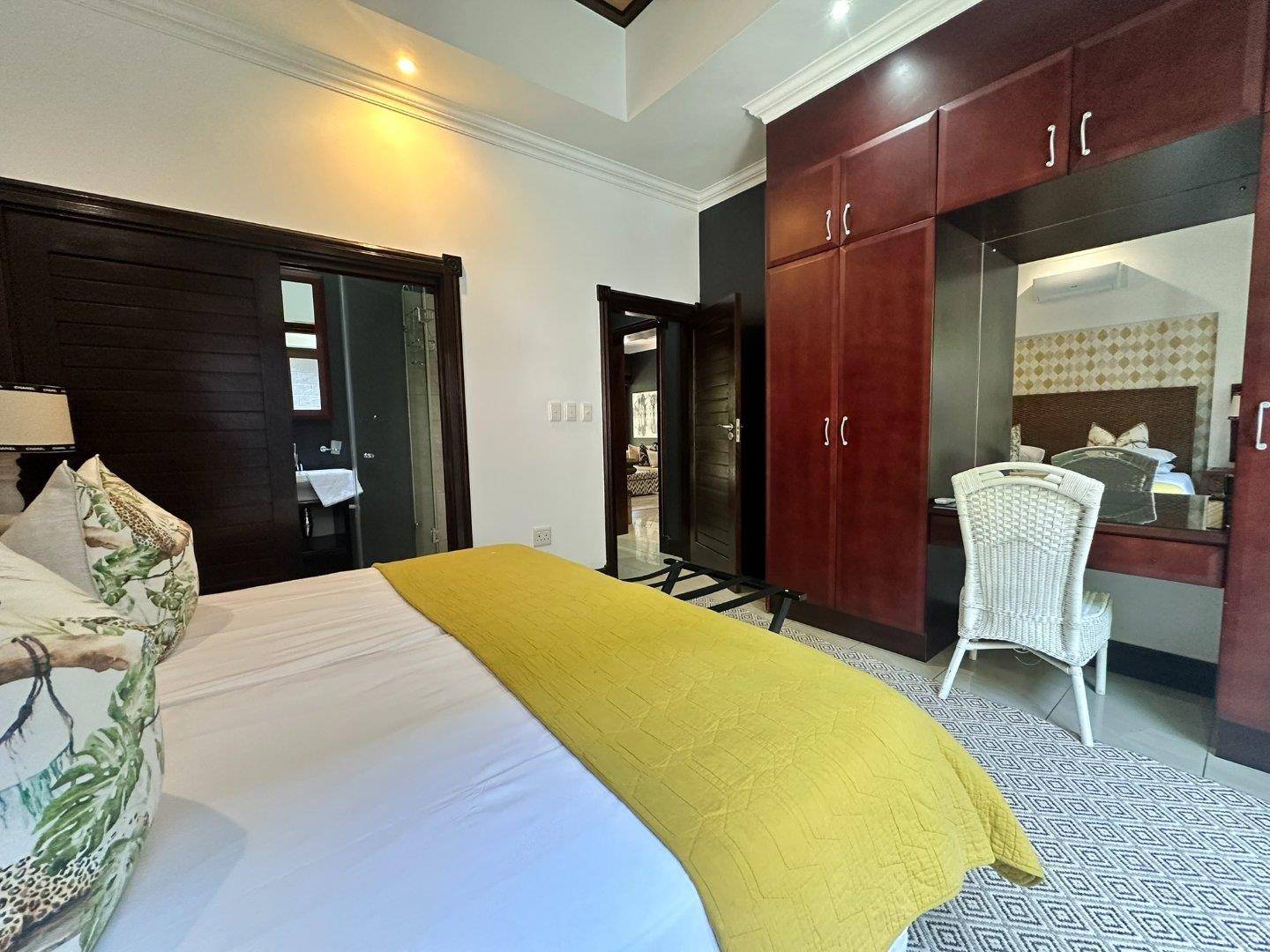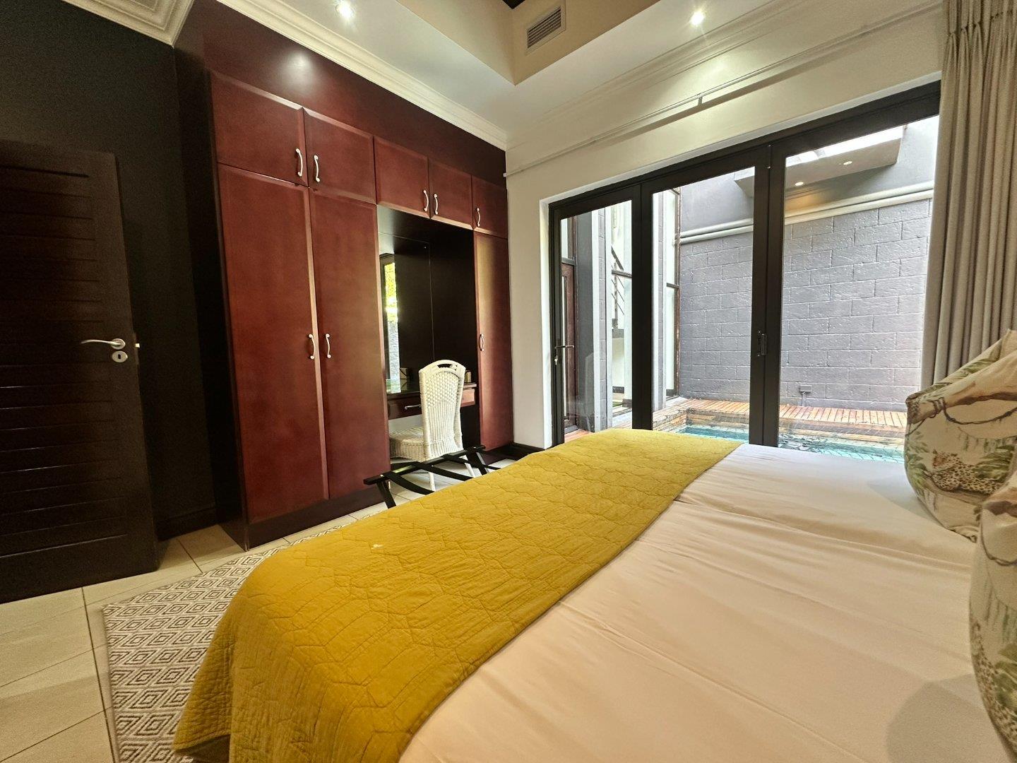 The expansive entertainment area flows seamlessly onto a large deck with distant sea views, complete with a jacuzzi, making it perfect for hosting or unwinding while enjoying Zimbali’s coastal lifestyle.