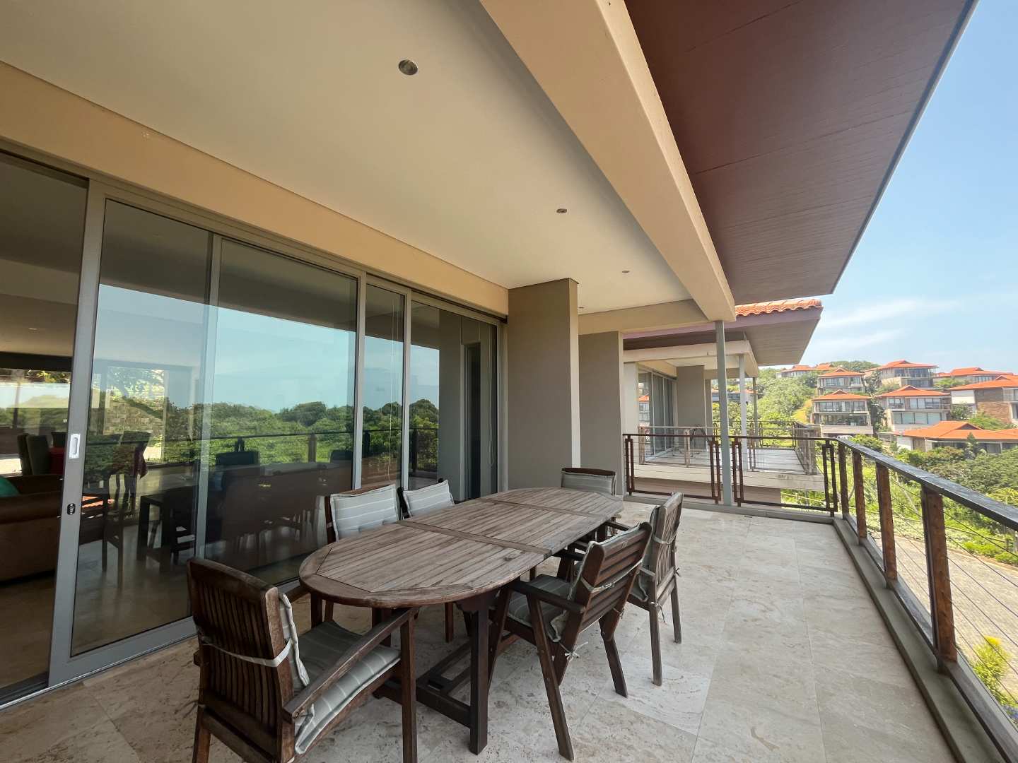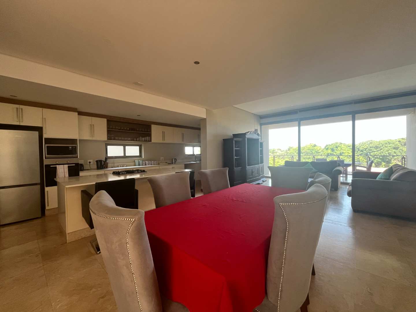 Step into a large open-plan living area that flows seamlessly into a modern fitted kitchen with a gas hob, perfect for easy entertaining. The sliding doors open onto a generous balcony, where you can unwind to the soothing sounds of the ocean in the distance.