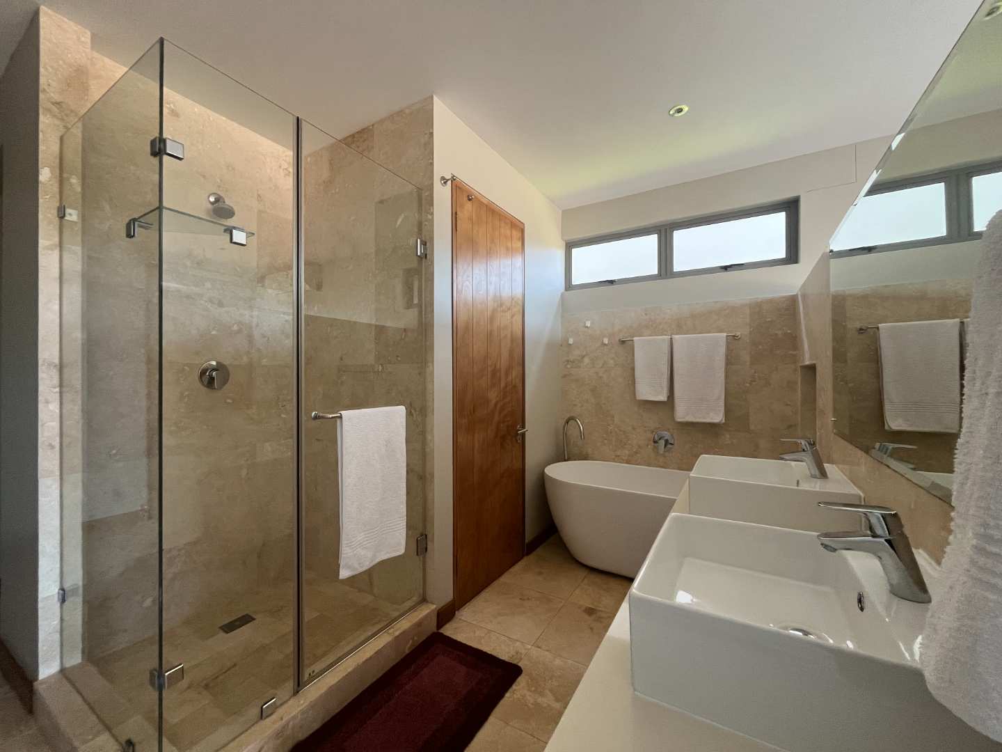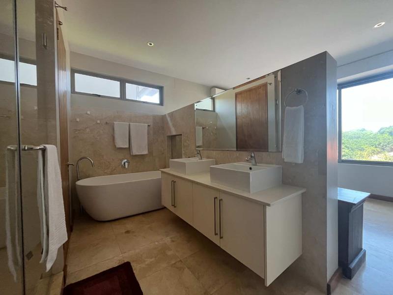 A luxurious main bedroom with a walk-in closet, a modern en-suite bathroom with his-and-hers basins, and ample natural light.